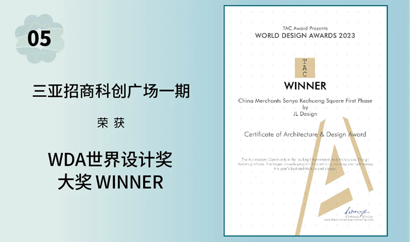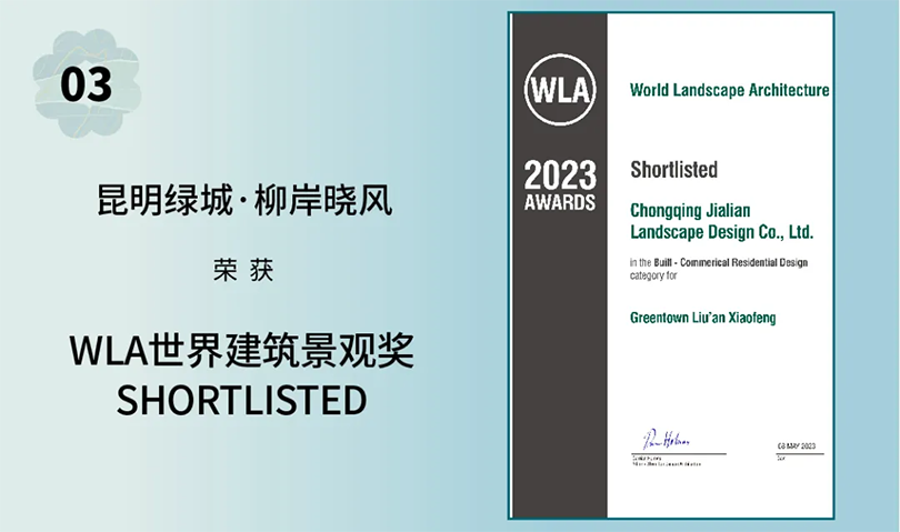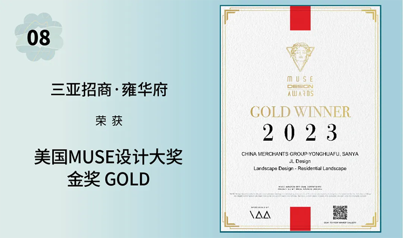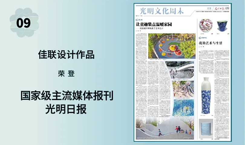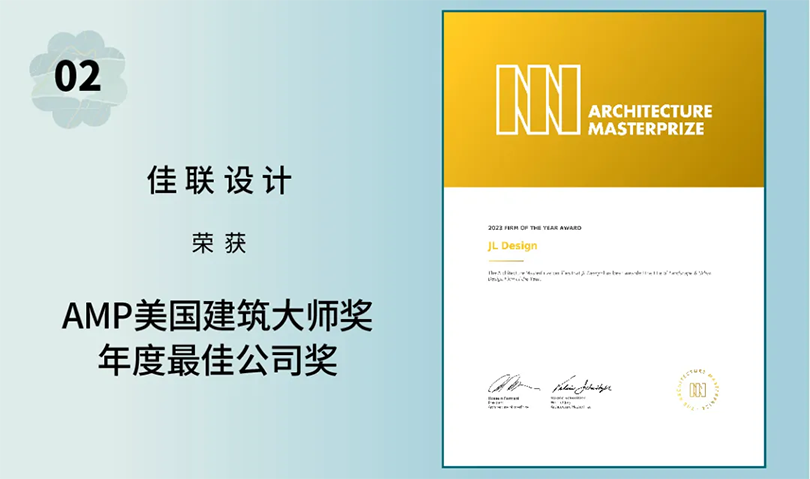 2023 年,佳联设计凭借卓越的设计品质,在国际国内多个大奖中满载而归,更是一举夺得 AMP 美国建筑设计大师奖年度最佳景观公司奖,成为全球唯一获此殊荣的公司;在收获社会荣誉的同时,佳联设计还收到了甲方领导的感谢信等赞誉;此外,佳联设计的作品更是荣登国家级主流报刊《光明日报》,这些都是对我们作品的高度认可,也是对我们团队辛勤付出的最好回报。