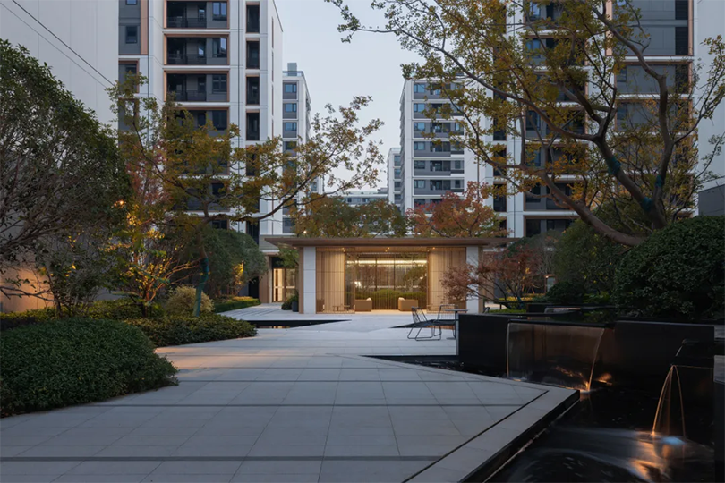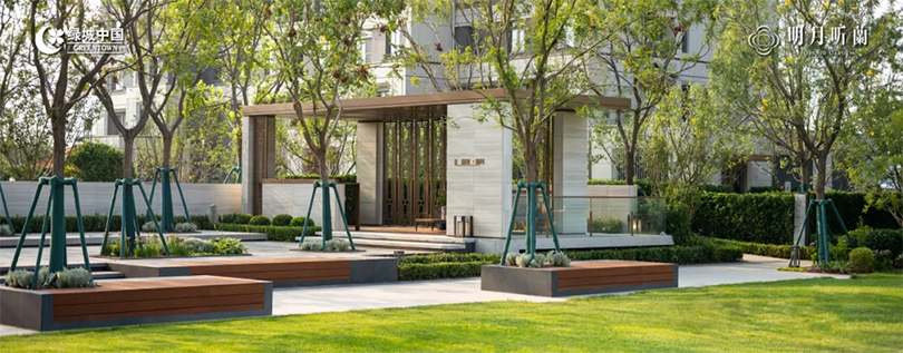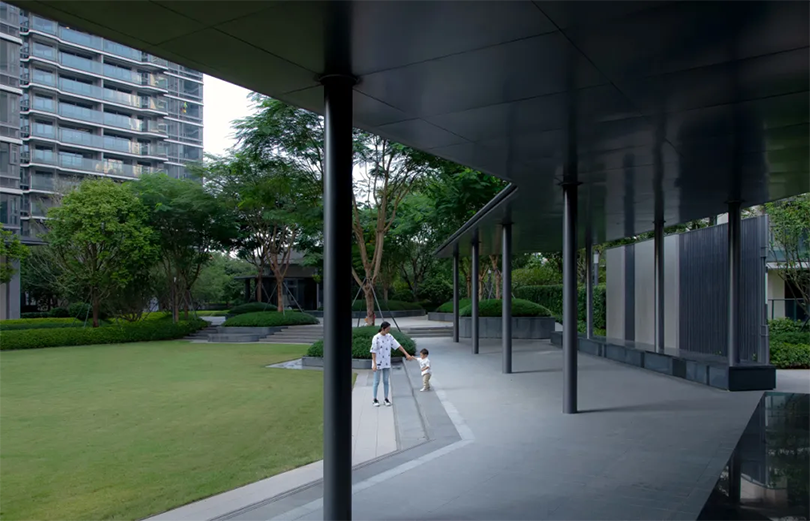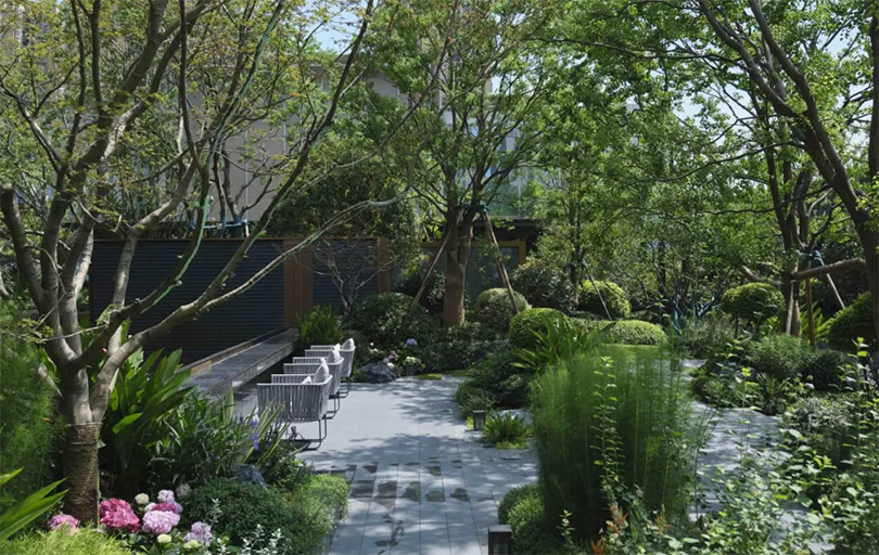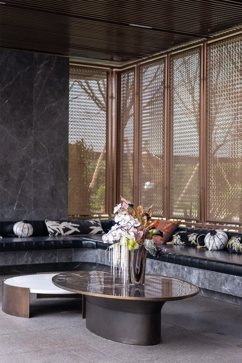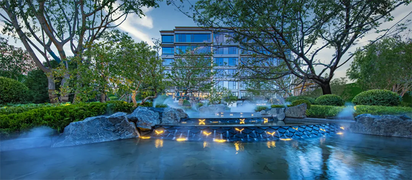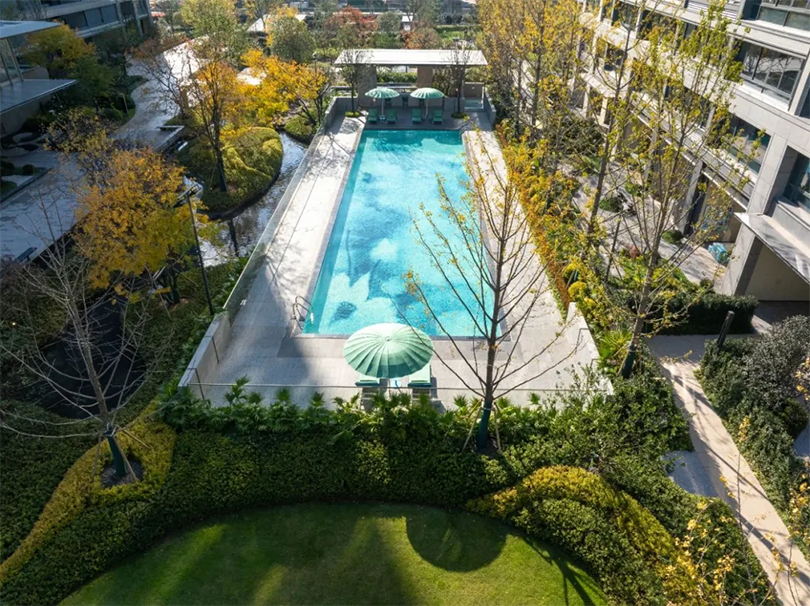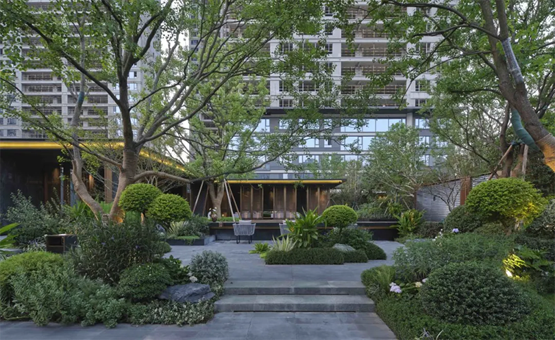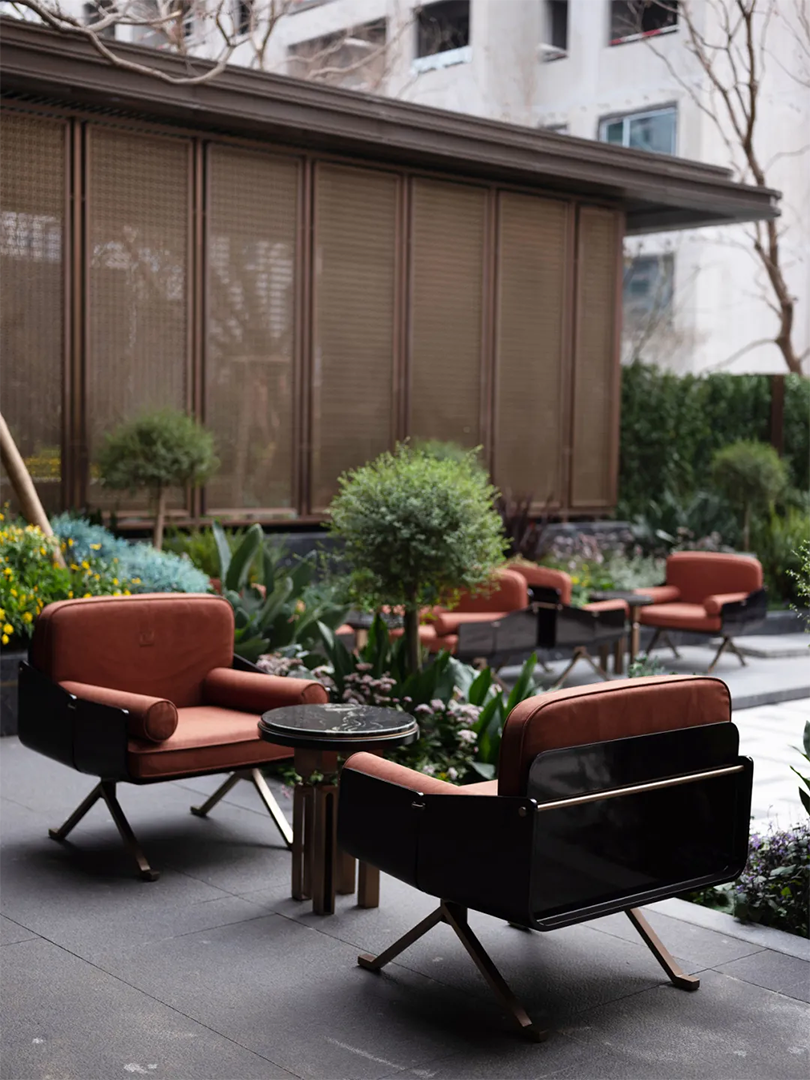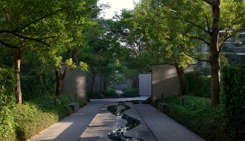 西安,是历史与时尚,繁华交织的城市。我们试图在这座鼎沸城央中打造一处奢华秘境,让自然可以缩减到适宜人体的尺度。在空间上,我们借鉴苏州园林的造景手法,将雲蘭设计成了两个套院,通过廊架串联。每个院子里面的景相互借景形成合力,塑造出悠然、安静的生活环境。同时充分考虑人对场景使用的需求,把精致软装搬到室外,花镜组团,泉水潺潺,营造出酒店般的静谧感和沙龙感。