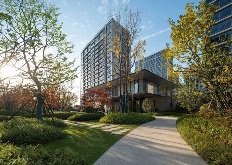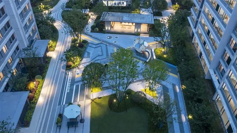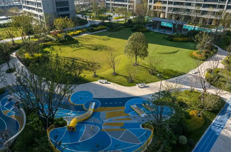 宁波绿城春来晓园由东西两个地块组成,景观空间呈现一轴,两环,两庭,一街的空间格局。在场地的营造中,我们将公园的场景和生活引入社区,与湿地公园相互借力,东区置以静水流森的诗韵场景,西区置以山林野趣的互动生活场。植物配置丰富,春有繁花、秋有红叶,让社区居民季相变化中,多维度的感知自然。