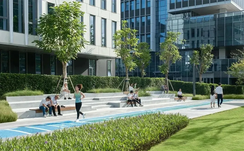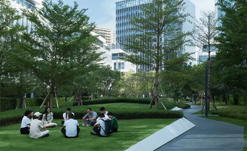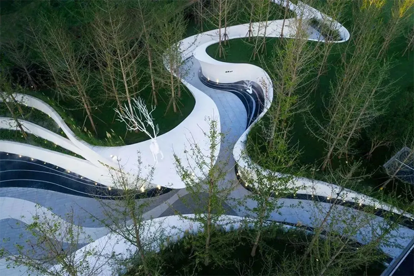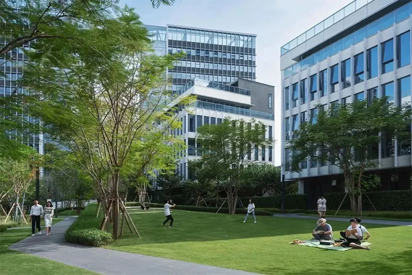 招商科创广场一期位于三亚市崖州湾核心区深海科技城,通过极简的折线设计语言,开放共享的景观布局思路,营造了静谧会客、户外办公以及滨水休闲运动等多层次空间。异形树池模拟海浪山丘,鳐鱼雕塑唤醒场地记忆,叠加本地特色植物运用,使整个景观空间与当地的人文环境联系更加紧密。