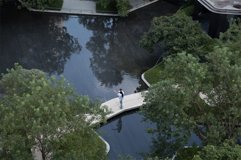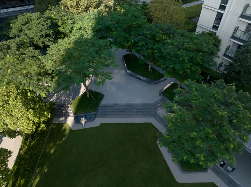 广场、廊架、草坪,地势层层往下,恰如河流绕过缓坡、礁石,层层跌落,在顺应自然的同时,又丰富了视觉体验。草坪与廊架衔时的特意退让加宽,用空间和距离,来营造旷然舒适之感。