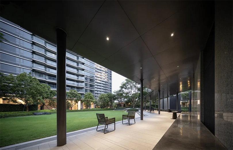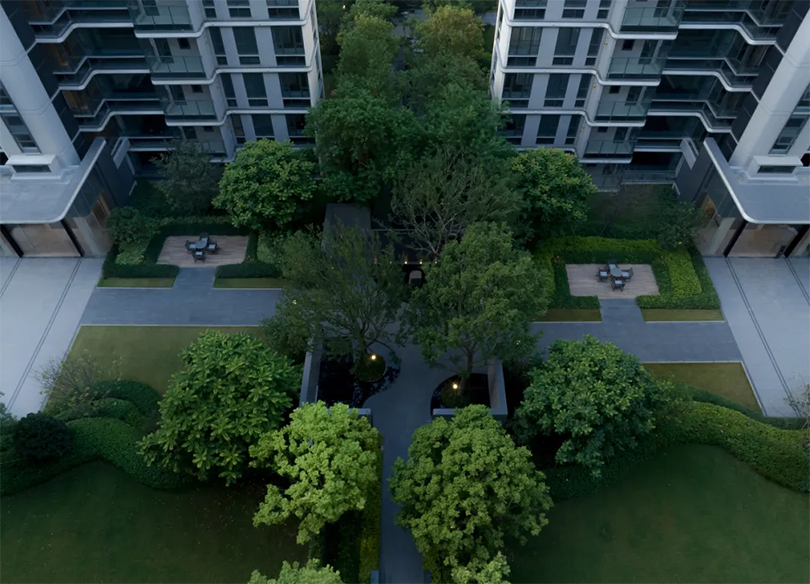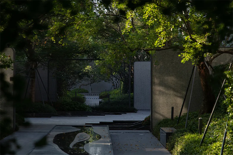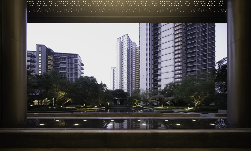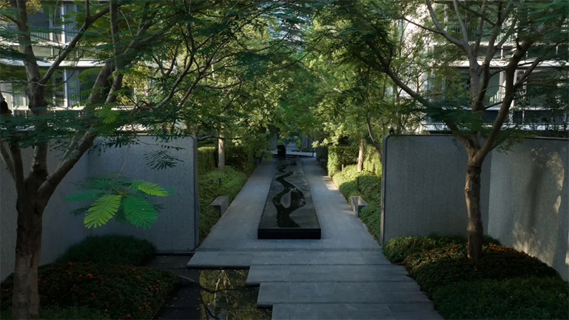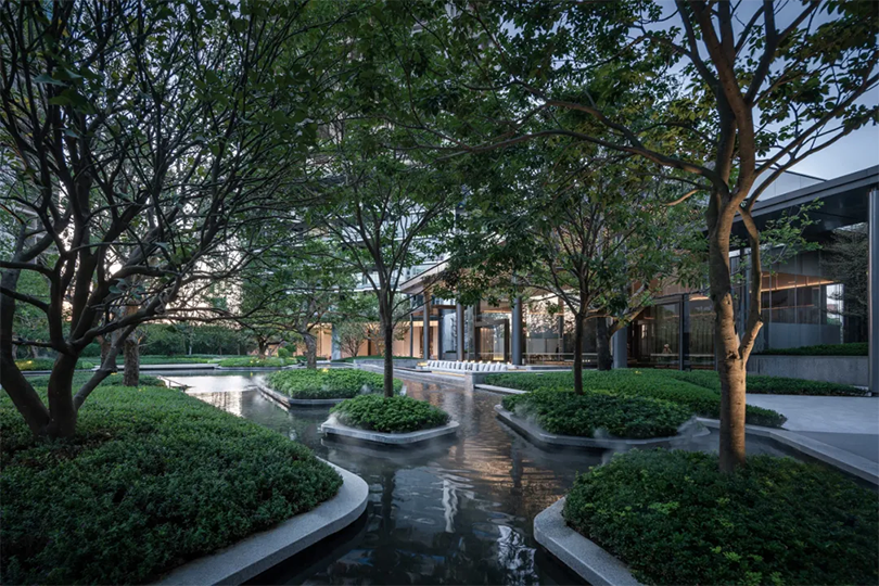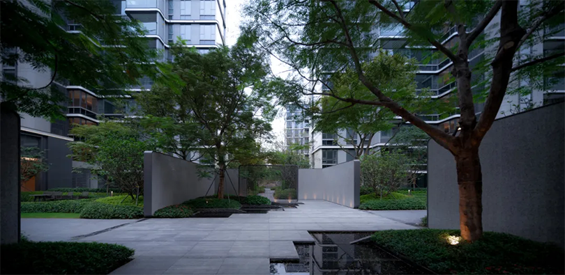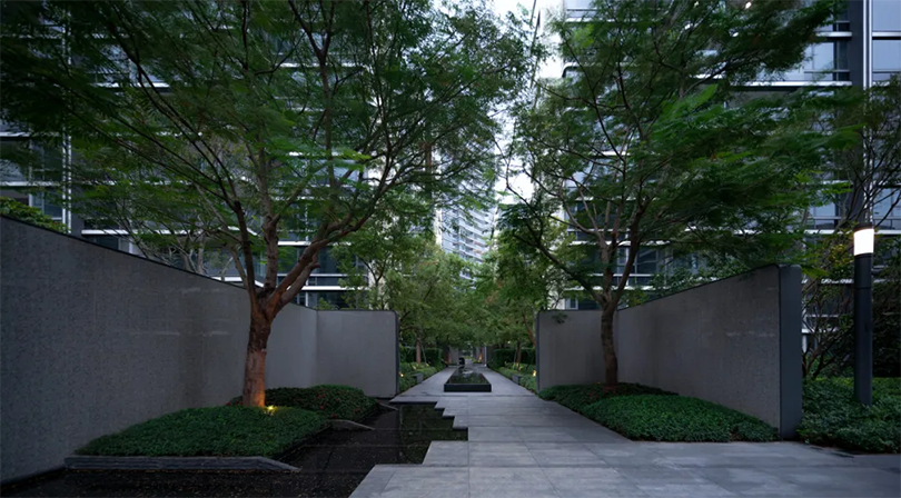在闹市中觅安宁,于清幽处探禅意。当心静下来了,就更容易去遵循本心,悟禅意,悟人生真谛。“曲径通幽处,禅房花木深”,相较于开阔的高层轴线,这条狭长的洋房景观中轴线,就如这句诗一样,曲径通幽,饱含含蓄内敛的东方雅韵,展现出一幅清溪流水伴幽林的画面。