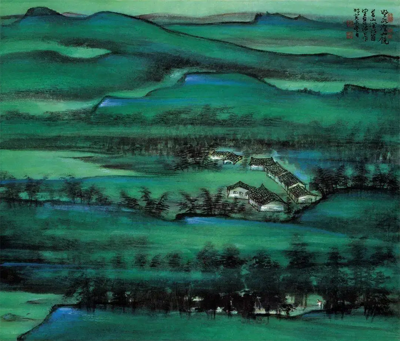 当阳光照耀时,整个场景多了更多的明暗层次,在春辰、碧山、翠微、青古、螺子黛……这些中国传统绿色的挥染下,这幅立体的青绿山水显得明艳且生机勃勃。