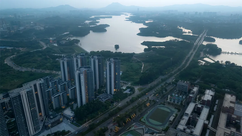 十二月初的东莞,虽临近小寒,但由于受海洋气候调节,气候相对稳定。此时的松湖林语内,依然绿意盎然、翠浪滚滚,层层叠叠的景象,好似一幅青绿山水画,给人以清爽疏朗、一眼万年酣畅的体验。社区的两条生活脉络,宛若一河、一溪,一个生活、一个游梦,似生活与梦想交织成一幅美丽的画卷,演绎着属于松湖内独有的故事。