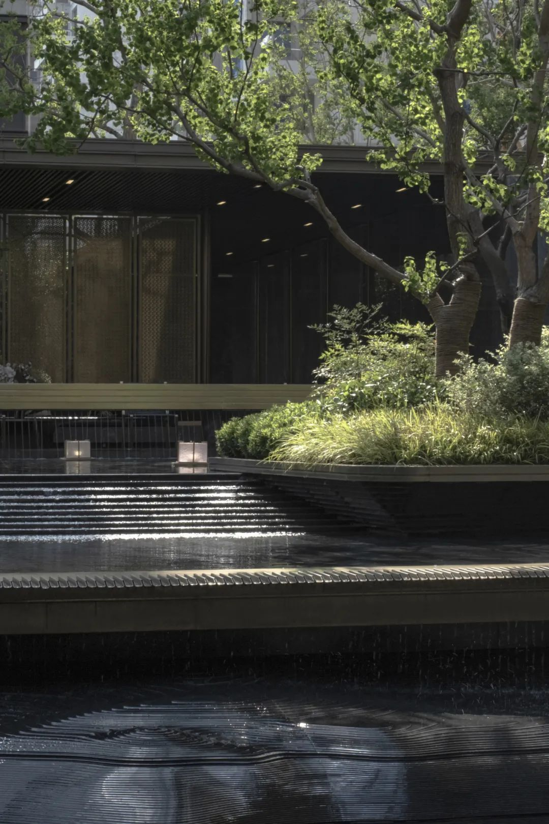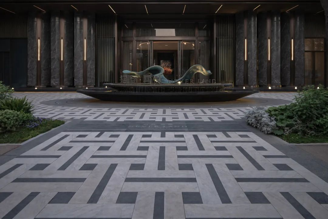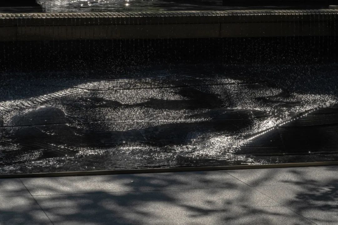 步入院内,犹如跨过巍峨秦岭南北分界线的体验一般,热浪渐消,暑意与疲倦渐隐。更为欣喜的是,低头的一刹那,眼前便是呈现的3D秦岭水景。褶皱断层山地在此处幻化成起伏的等高线,经过层层水流浸润,以及光影多维度的折射,使得造型更加细腻且肌理更加丰富。