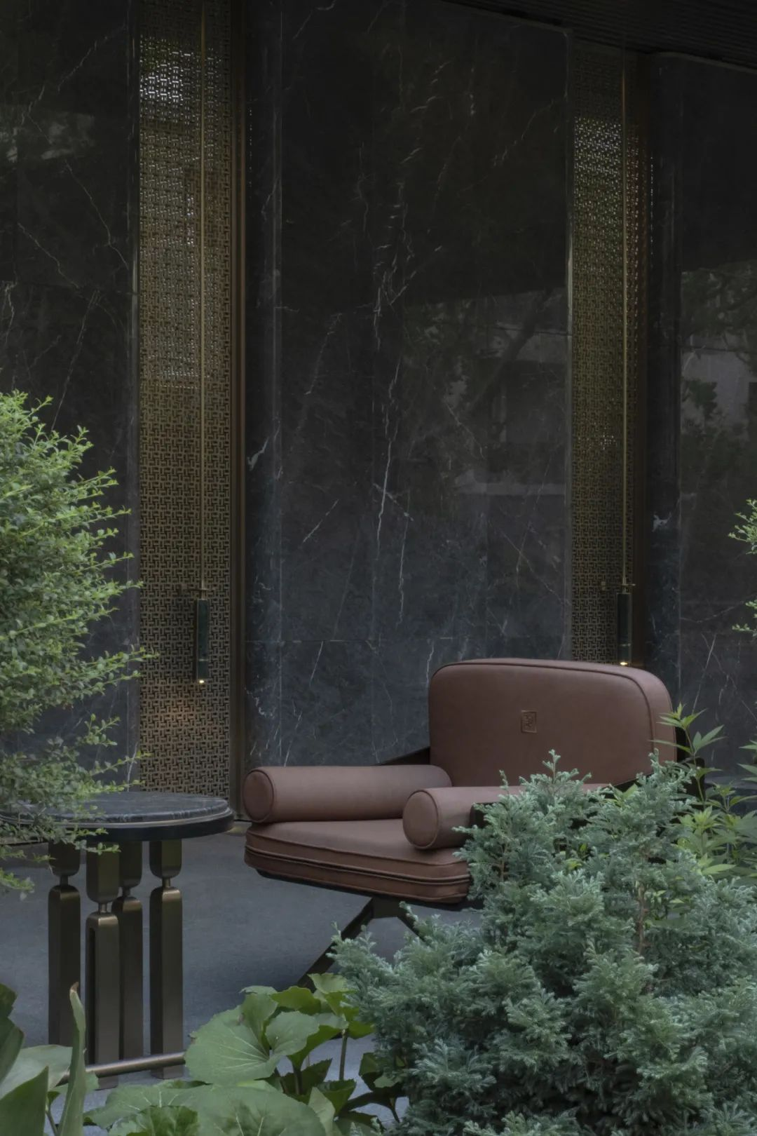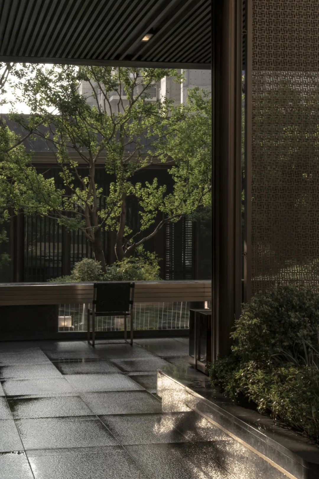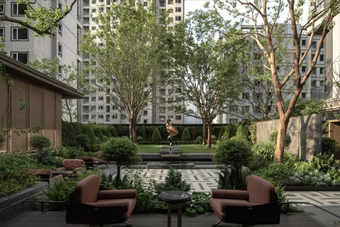 后场庭院就像西安城的大街小巷一样方正对称,或许是为了能够更快的融入西安人的生活方式。中国传统色缁色的精致的软装,为整个庭院又增添了一抹古韵。上下两层休憩场地,一个是屋檐下的诗意,一个是绿意深处的芬芳。