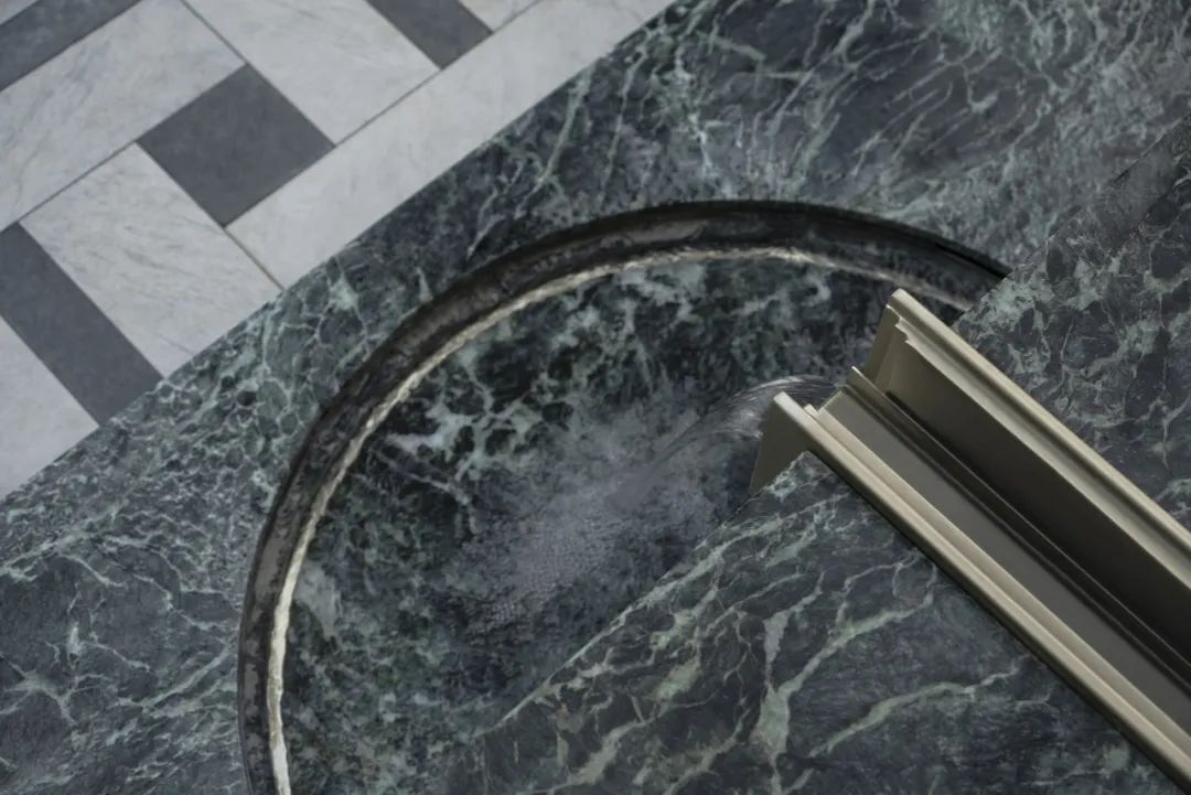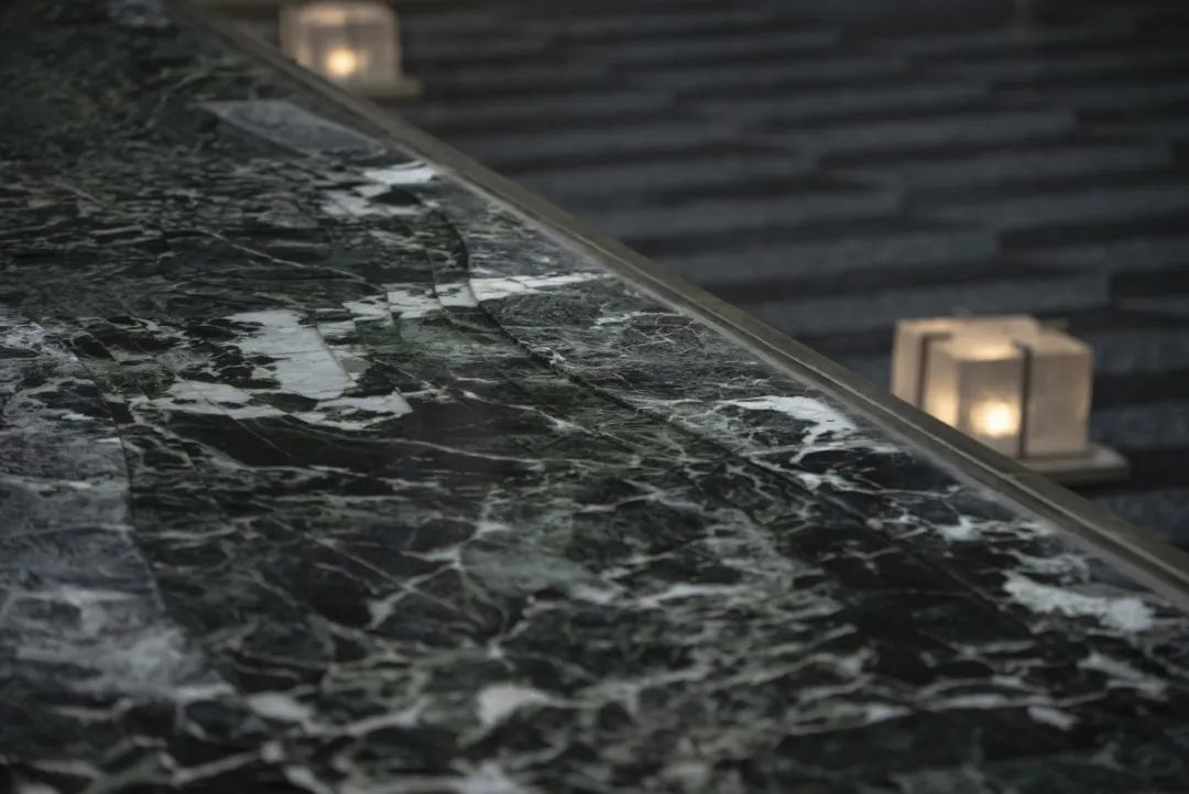 似山涧中的清泉潺潺而出,淌过用普拉达绿奢石镌刻的流水吧台,在精致的金属边框下的包裹下,展示了曲江池作为皇家园林时的奢雅气质。而桌下的艺术线帘瀑布,又让整个场景更加充实饱满,且更有艺术气息。落座于此,眼前仿佛浮现出昔日曲江池边诗人们的意气风发。