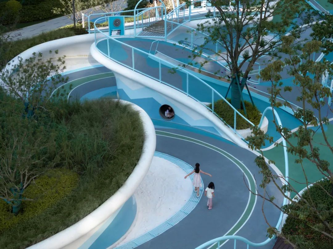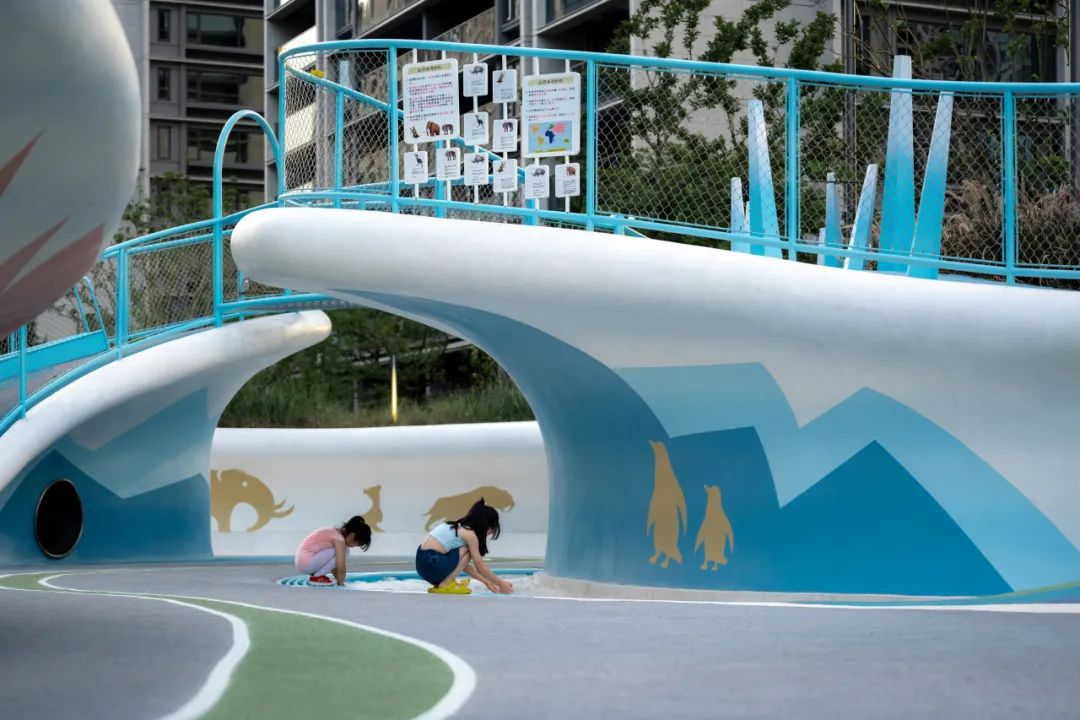 当他们环游到动力抽水装置时,还不忘停下来去尝试一下。此处的戏水区如同蜿蜒的小溪一样缓缓流淌,轻柔得像是在歌唱,圆满了小朋友们对耍水的渴望。