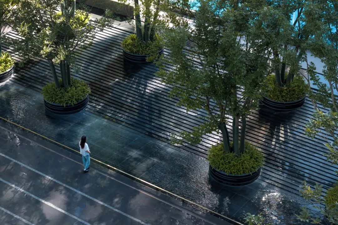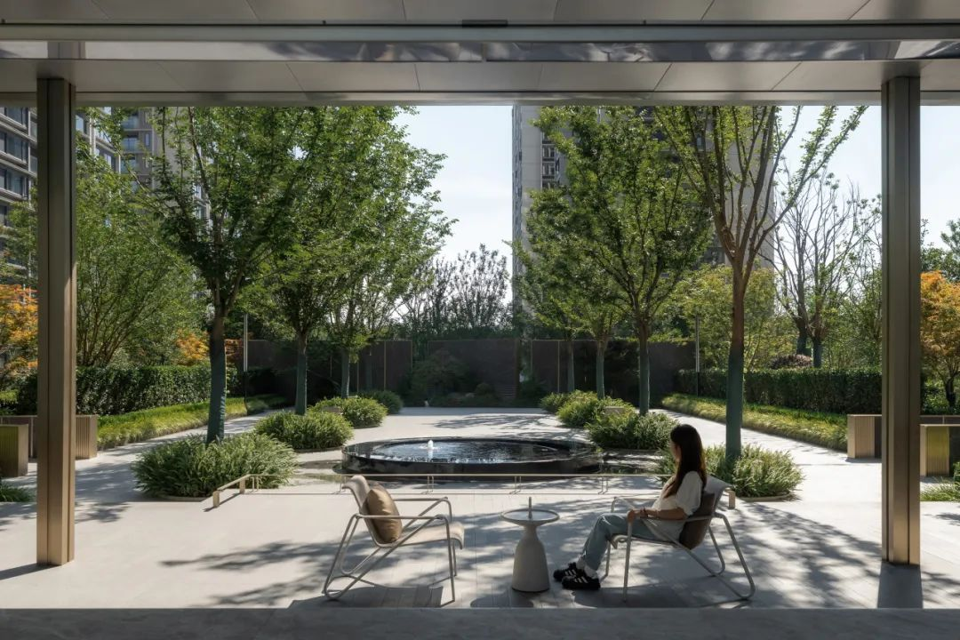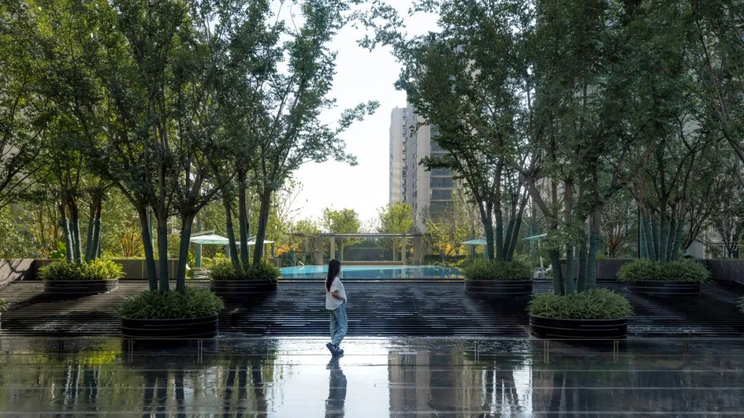 走出归家大堂的刹那,扑面而来的热浪便拥我入怀,它带着江南特有的湿润与热情。走近树阴,丝丝水气拂面,带来些许凉意。跌水潺潺而下,光影随波游动,抬高的泳池似乎也变得更加广阔了。