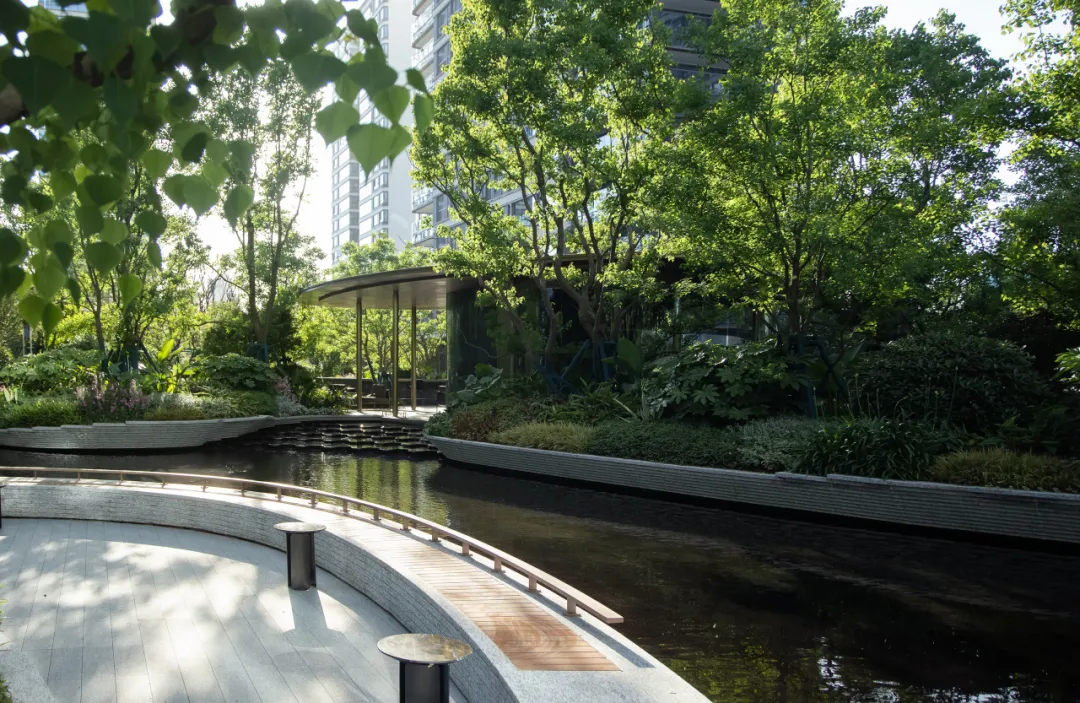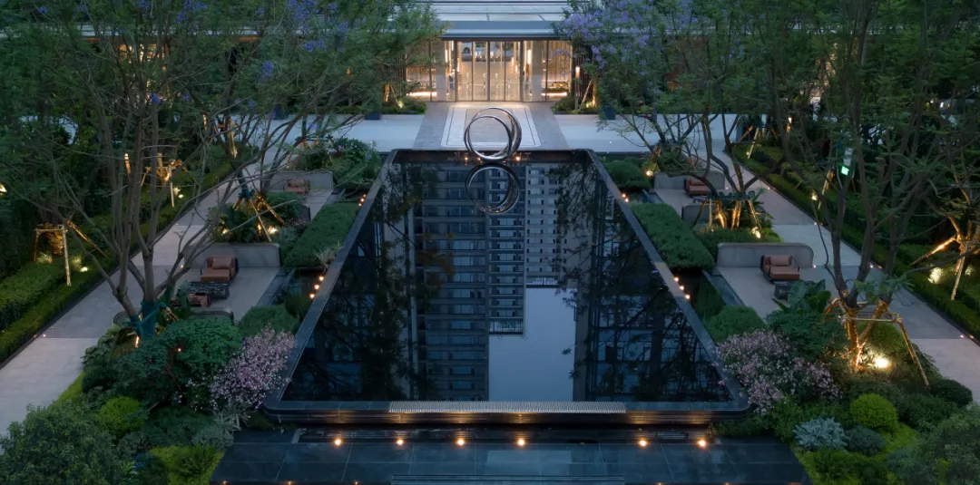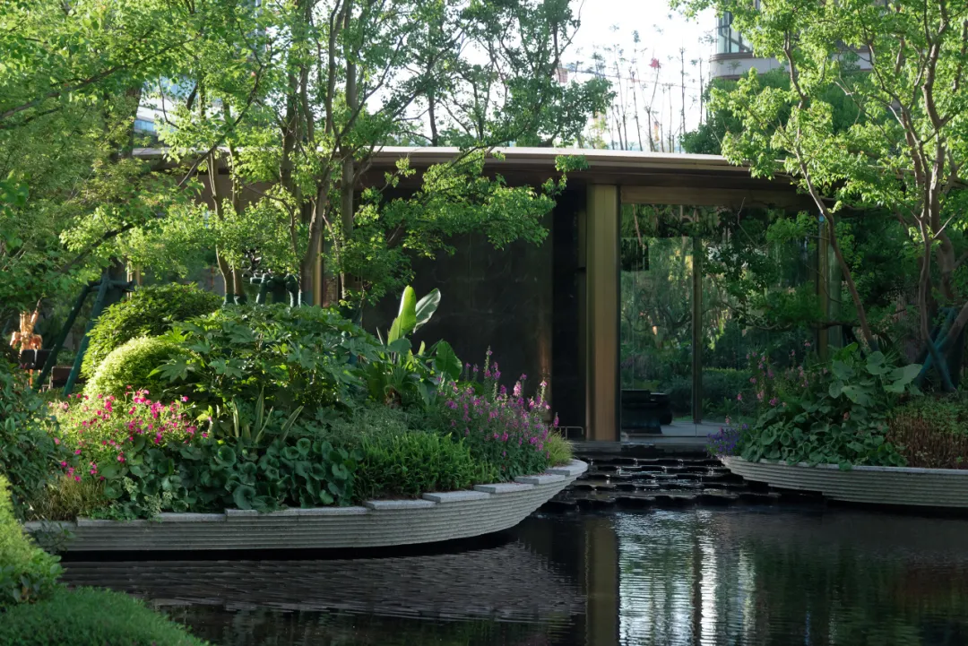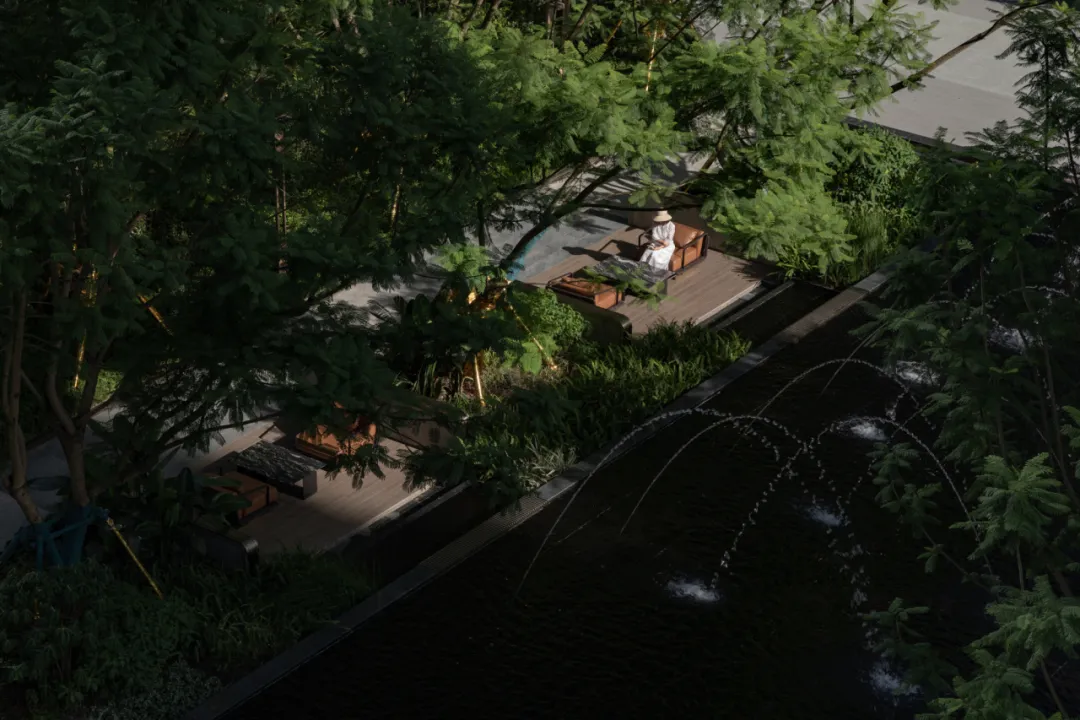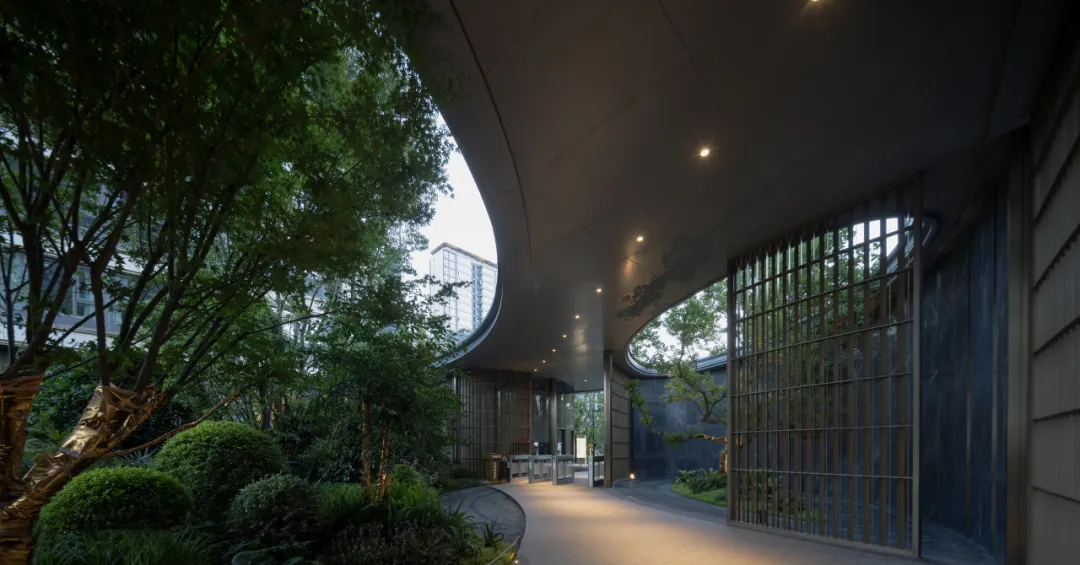 水轴尽头正对的架空层亦藏巧思。水景层层叠叠,与水轴巧妙联动,恰似一首灵动的交响曲,让整个空间体验接续得恰到好处。但这一份韵味渐渐多了些许内敛,宛如一朵悄然绽放的幽兰,散发着静谧之美。