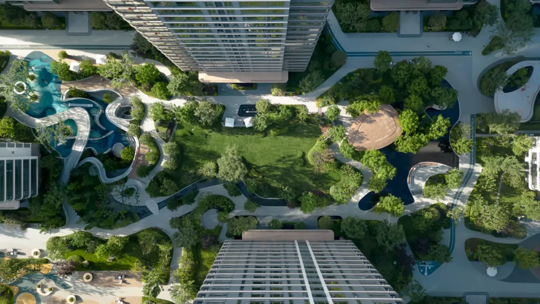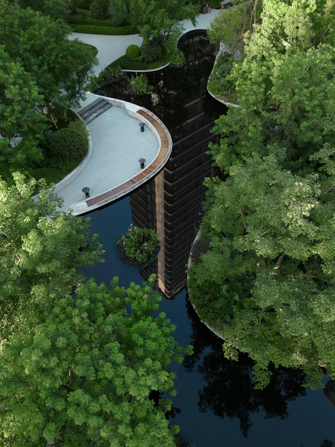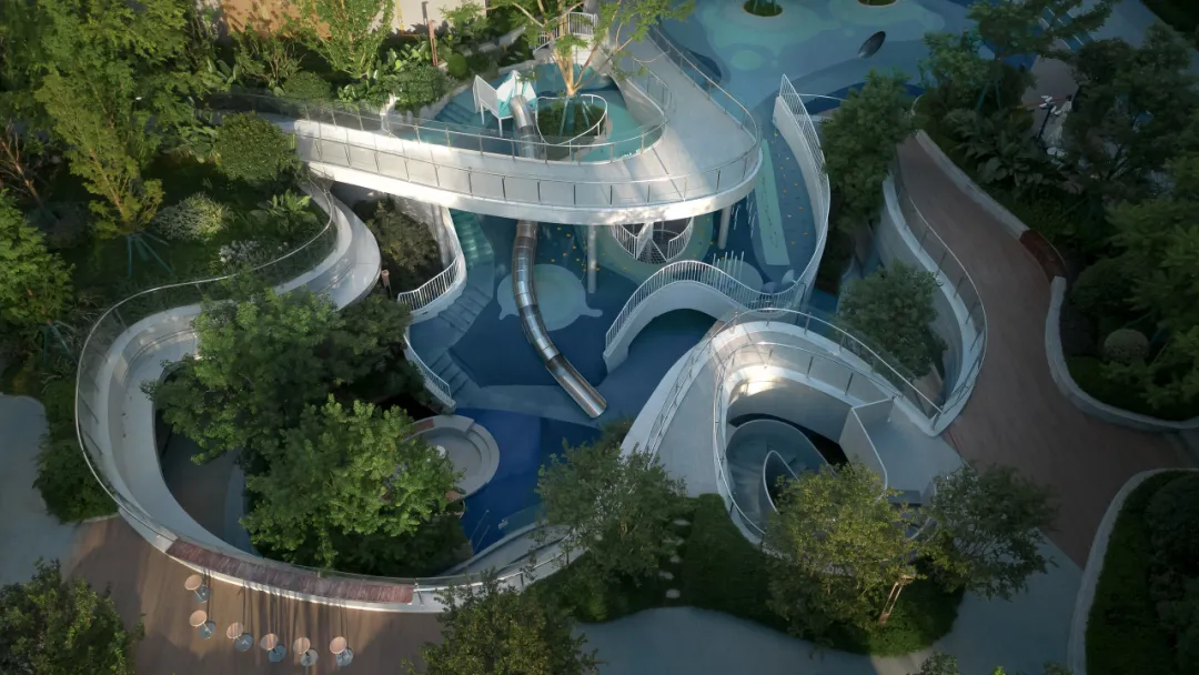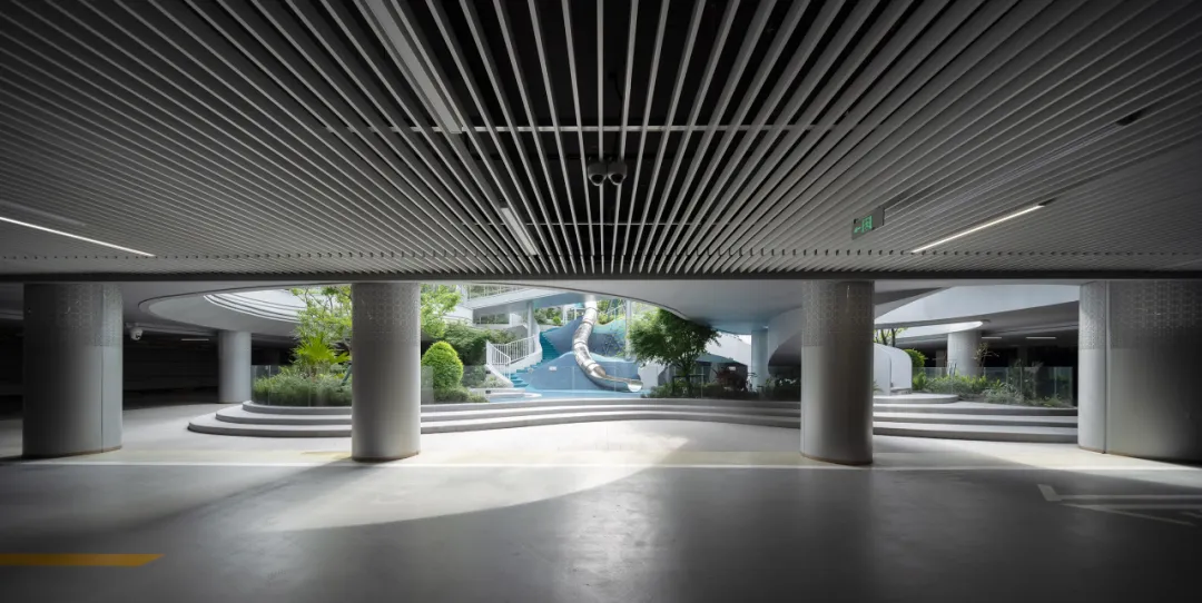水轴尽头正对的架空层亦藏巧思。水景层层叠叠,与水轴巧妙联动,恰似一首灵动的交响曲,让整个空间体验接续得恰到好处。但这一份韵味渐渐多了些许内敛,宛如一朵悄然绽放的幽兰,散发着静谧之美。