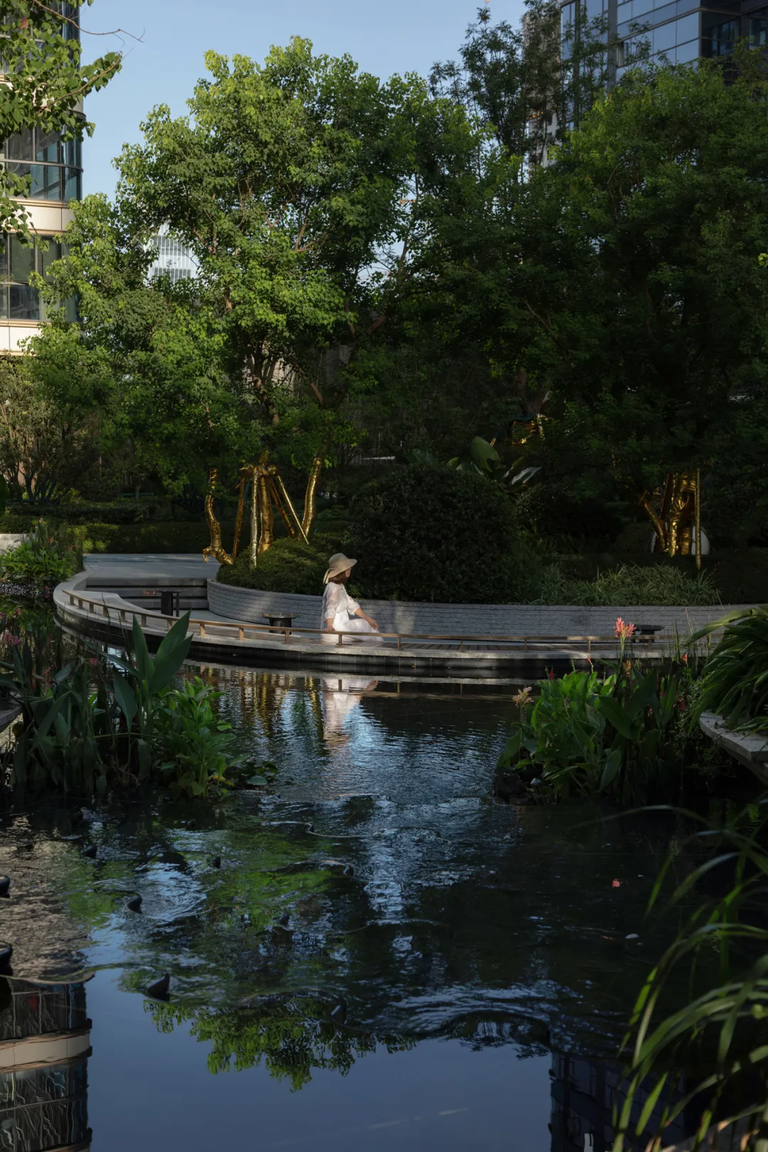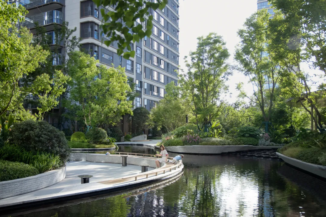 正如入口处的暗示,刚步入园内就遇见这片期待的水岸。曲池涟漪,浮岛密林,如同一幅生动的山水画卷,让人心旷神怡。我想乐天派的成都人出走户外来,一定会到这里坐坐。下沉的亲水院坝,如同一个温馨的港湾,等待着人们的停靠。沐浴阳光的同时,近距离的感受水的温柔与灵动,聆听林中的蝉鸣鸟叫,让身心在这里得到彻底的放松与净化。