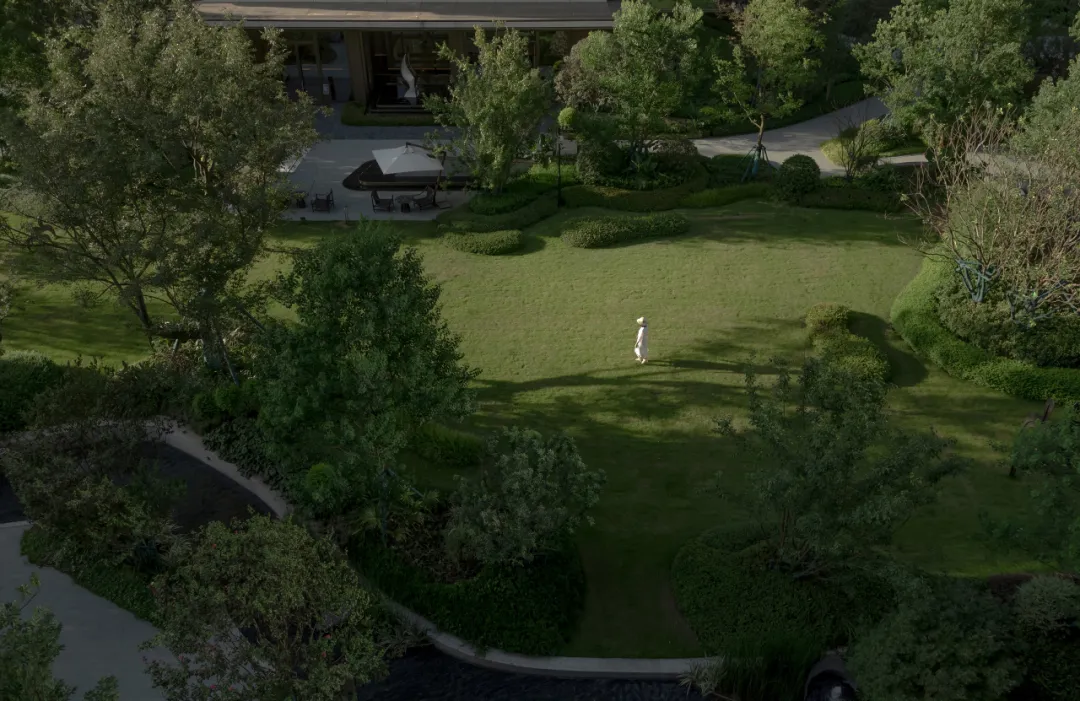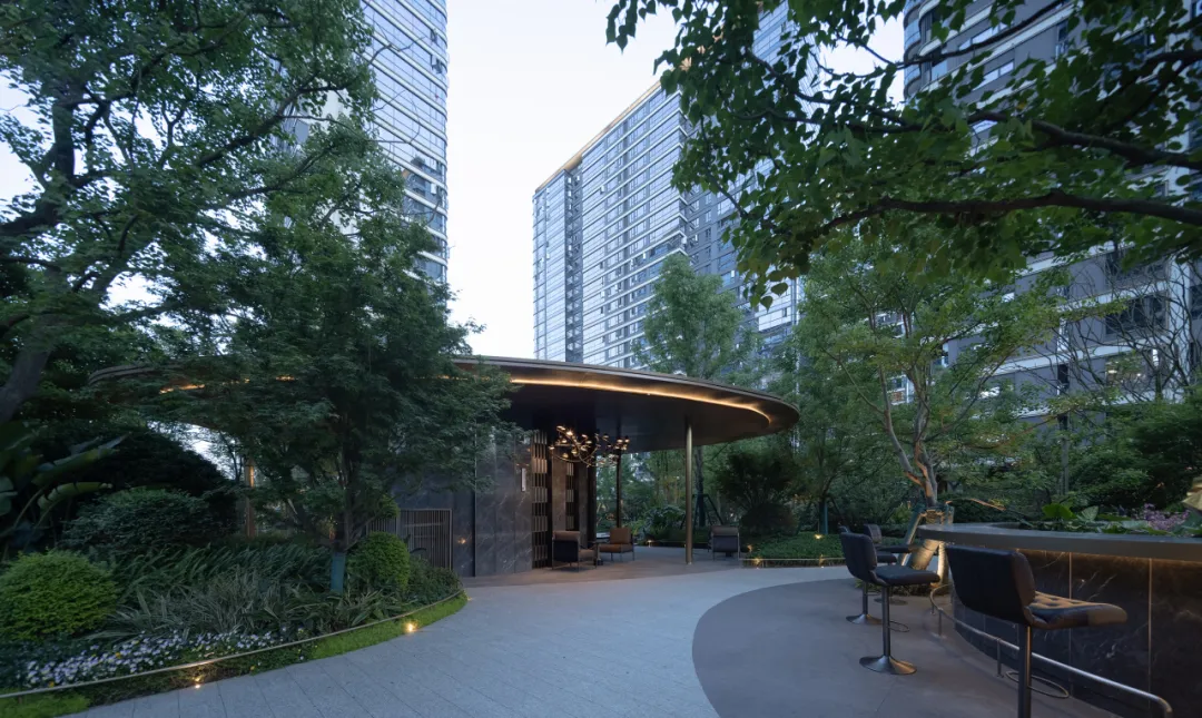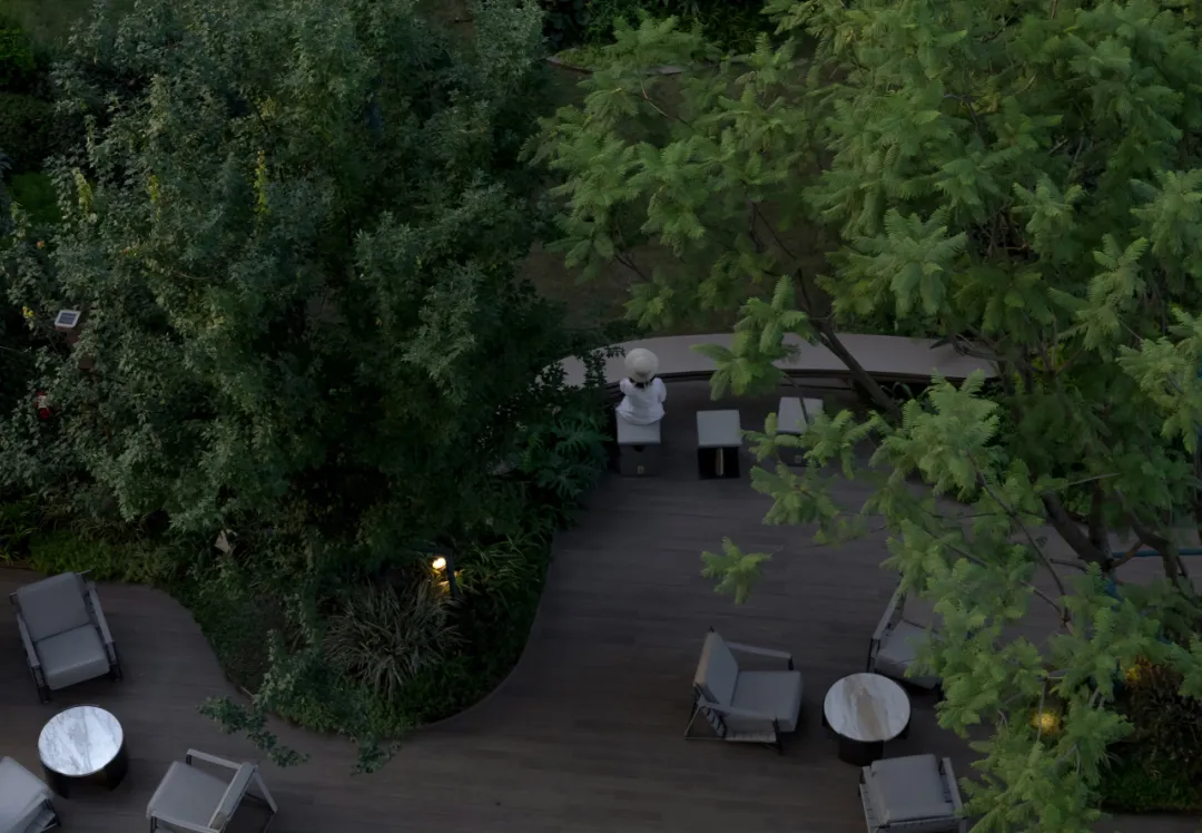 如果说上面的小院坝是话家常的温馨热土,那么这个清幽的林下院坝则是冥想沉思的静谧之地。草坪的边界与木质步道以柔和的曲线交织,弧形的吧台似优雅的弯月静置其中,散发着宁静的气息。在这清幽之境,一杯香茗,一本好书,便能让人沉浸其中,让思绪自由飘荡,让心灵得到滋养。