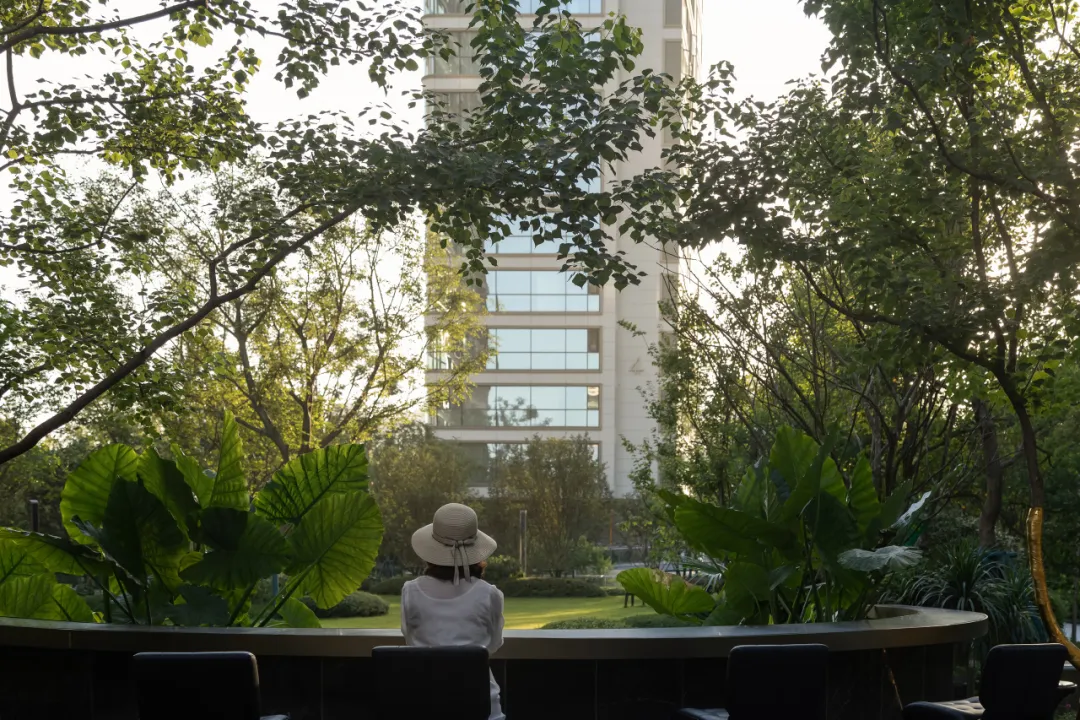 雨思轩的另一侧是视野开阔的阳光草坪,宛如一方梦幻的浮岛森屿。林下吧台处,静谧的乌桕树错落有致,围合出一个自然的画框,仿若将美景定格其中,令人心驰神往。大叶片海芋作为前景的植物底色,搭配特选朴树调和疏密与颜色层次,在夕阳的余晖下,诗和远方仿佛天涯咫尺。
