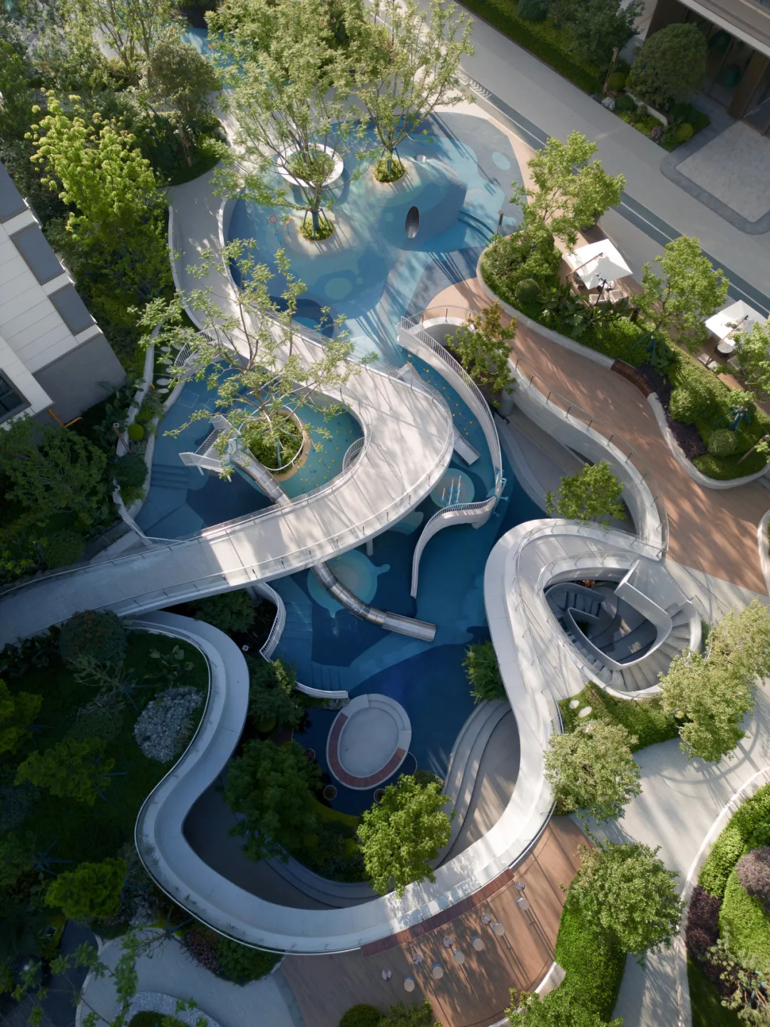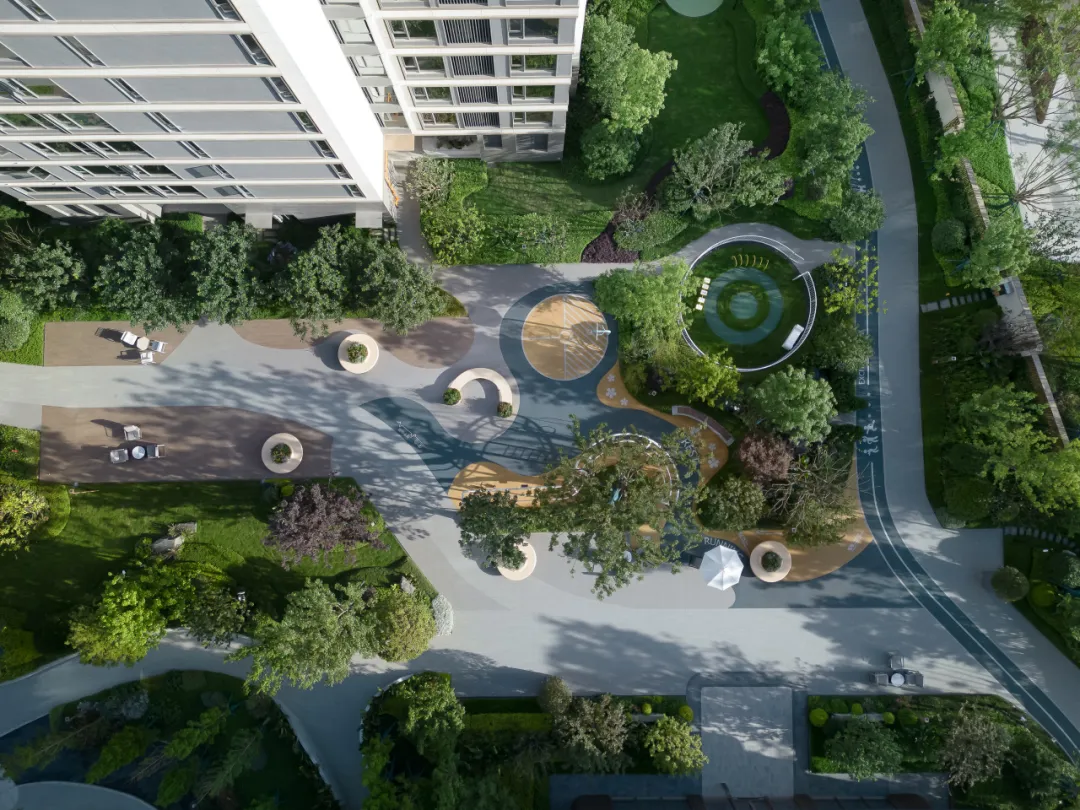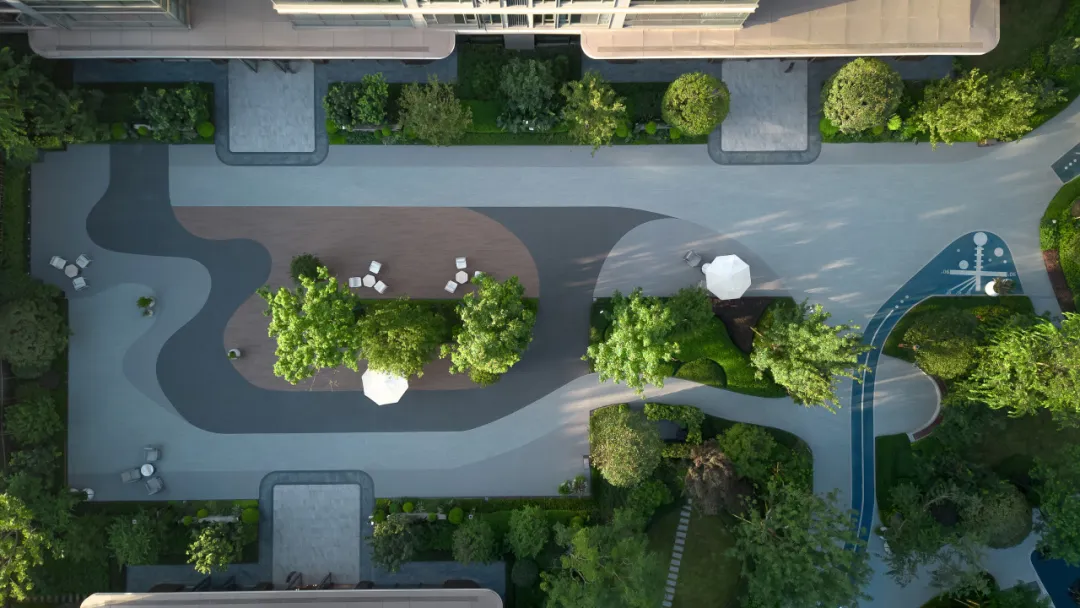 经过楼栋前的小院坝,流动的曲线、温馨的木色铺装,恰似灵动的水流在此散开,打破了这里的呆板,让轻松怡然的情绪完美接续。