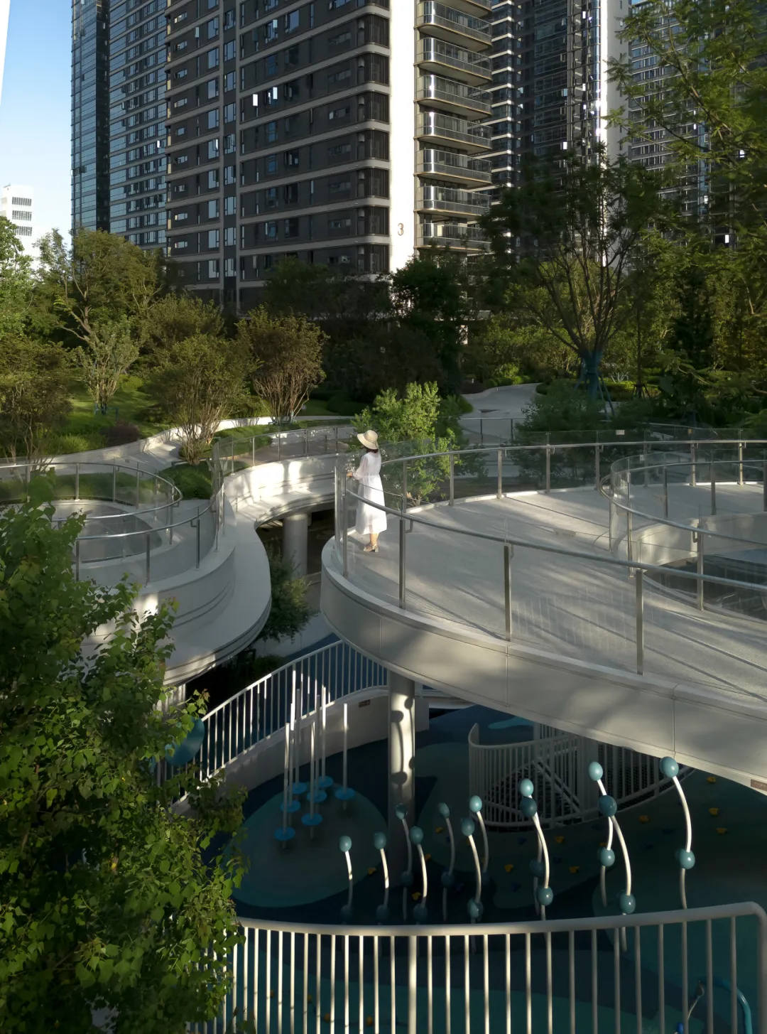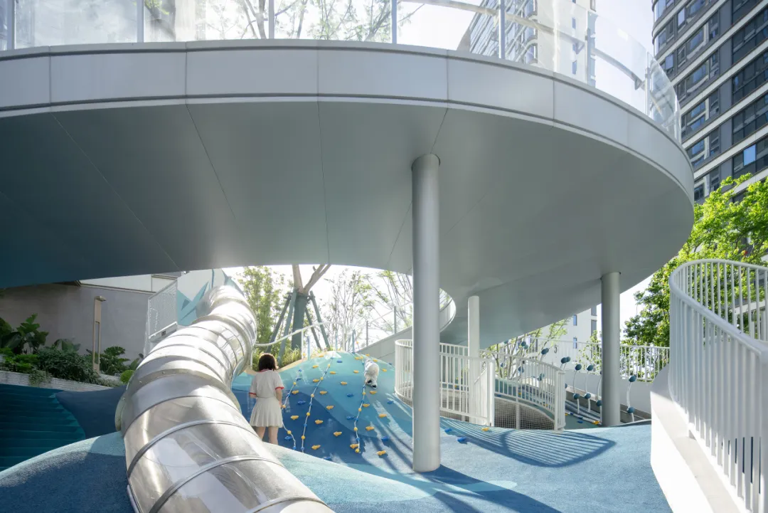 转而踏入休闲运动的院坝,这里有着清新活力的底色,明亮而有韵律。健身器械与座椅巧妙地镶嵌其中,彼此融合,浑然一体。游走于此,我的心情仿佛都随之律动起来了。