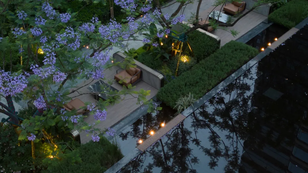 “春风又度紫云英,满树繁花玉步轻”,听闻今年天府序内的蓝花楹,绽放稍有迟滞,但总算不负期待。在这一抹紫色浪漫的交织下,林荫下的惬意与舒适体验仿佛被无限放大。木质铺装的温润踏感与皮质沙发的精致细腻,恰似岁月的和弦,每一笔都勾勒着时光的痕迹。伴着水边的天光云影,给人以无尽的恬淡与空灵,仿佛步入了一个远离尘嚣的雅致空间。