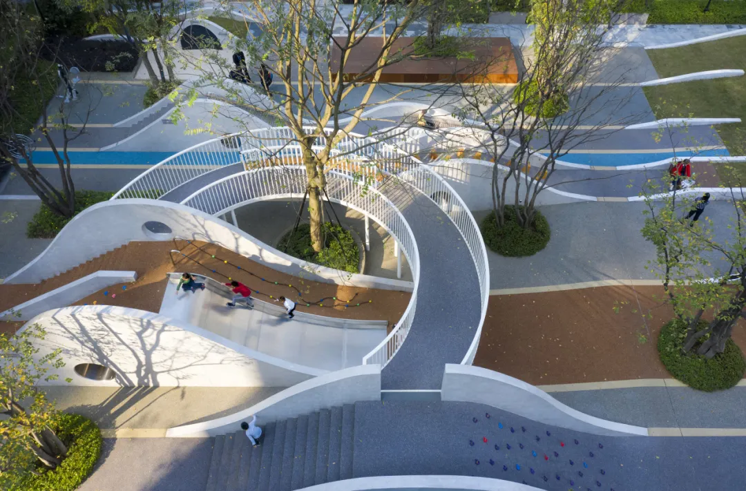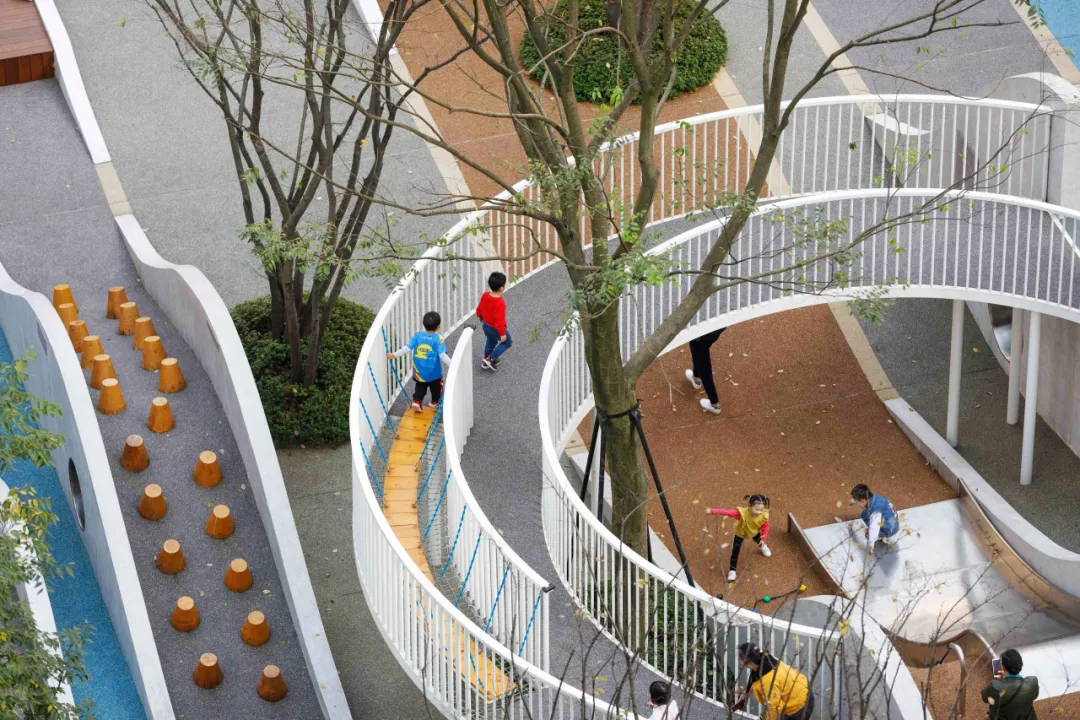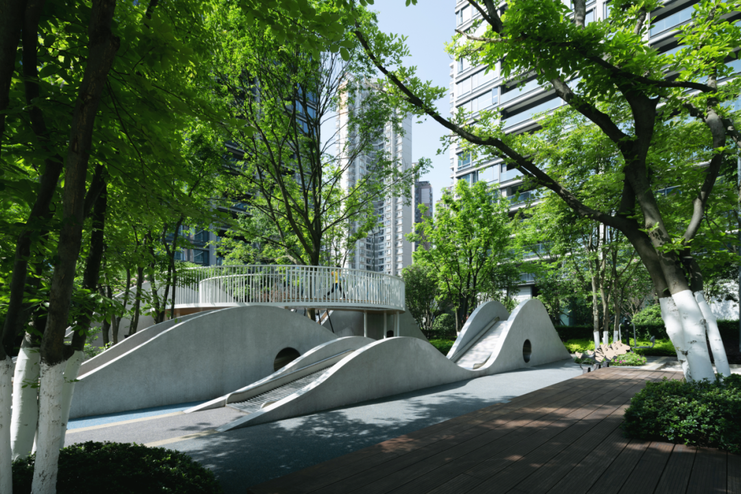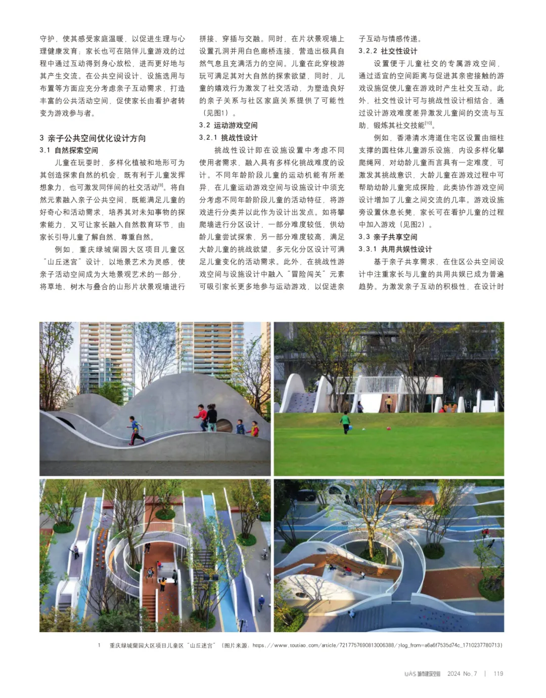 文中在3.1自然探索空间章节,引用了重庆绿城蘭园大区项目儿童区“山丘迷宫”,并描述到:“以地景艺术为灵感,使亲子活动空间成为大地景观艺术的一部分,将草地、树木与叠合的山形片状景观墙进行,拼接、穿插与交融。同时,在片状景观墙上设置孔洞并用白色廊桥连接,营造出极具自然气息且充满活力的空间。儿童在此穿梭游玩可满足其对大自然的探索欲望,同时,儿童的嬉戏行为激发了社交活动,为塑造良好的亲子关系与社区家庭关系提供了可能性。”