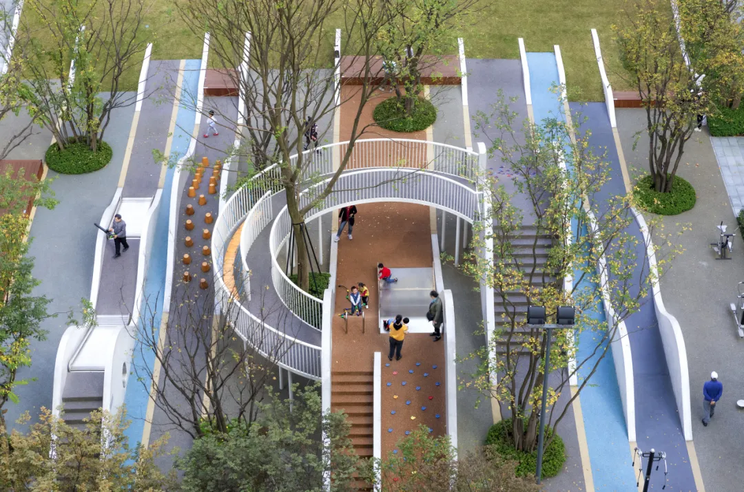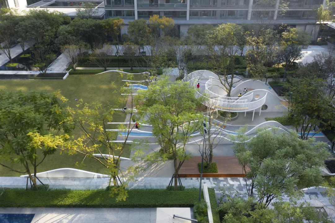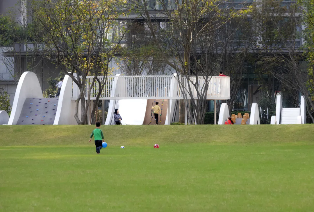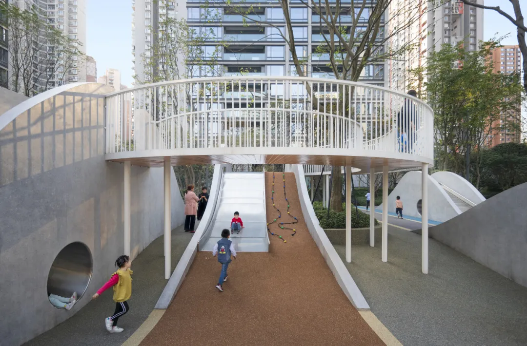 文中在3.1自然探索空间章节,引用了重庆绿城蘭园大区项目儿童区“山丘迷宫”,并描述到:“以地景艺术为灵感,使亲子活动空间成为大地景观艺术的一部分,将草地、树木与叠合的山形片状景观墙进行,拼接、穿插与交融。同时,在片状景观墙上设置孔洞并用白色廊桥连接,营造出极具自然气息且充满活力的空间。儿童在此穿梭游玩可满足其对大自然的探索欲望,同时,儿童的嬉戏行为激发了社交活动,为塑造良好的亲子关系与社区家庭关系提供了可能性。”