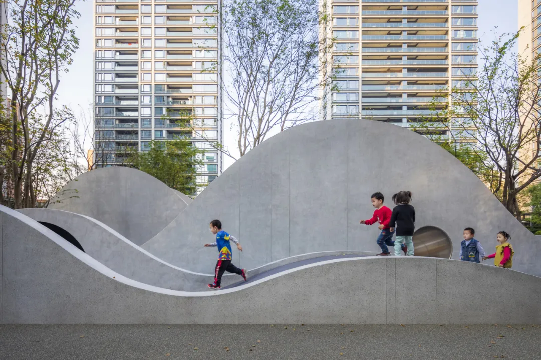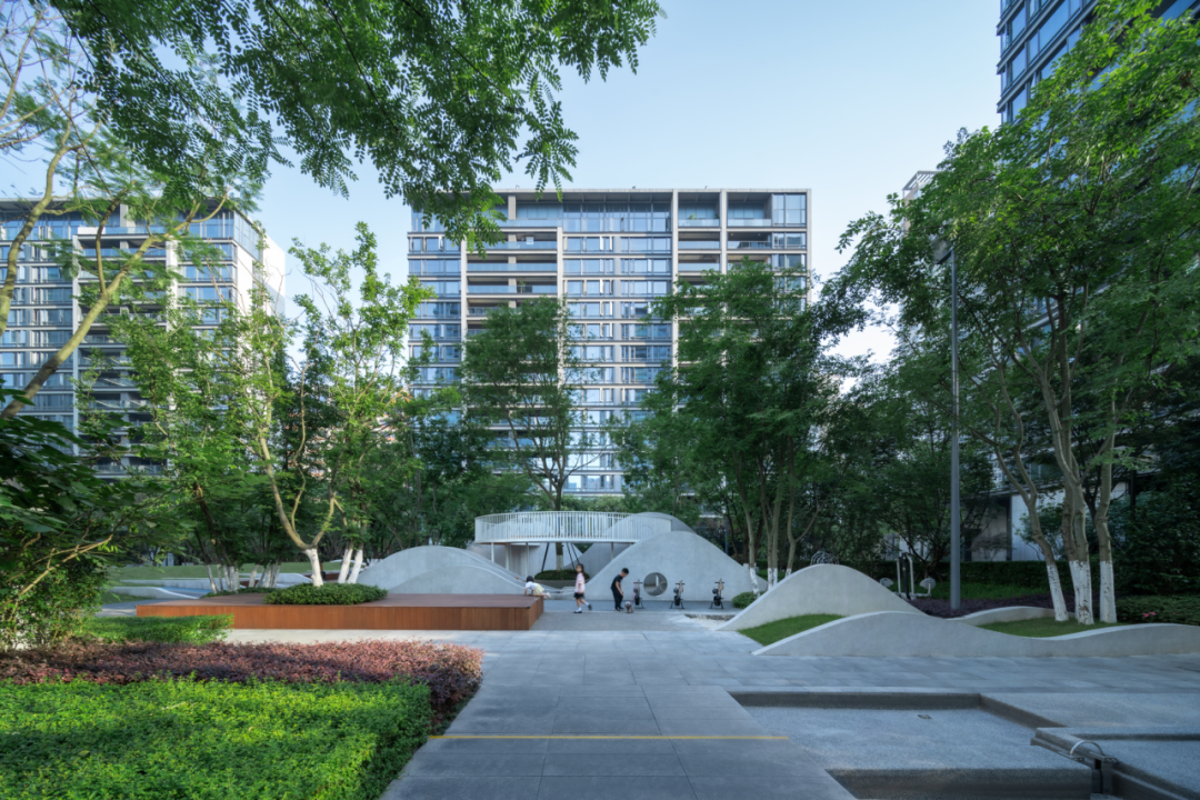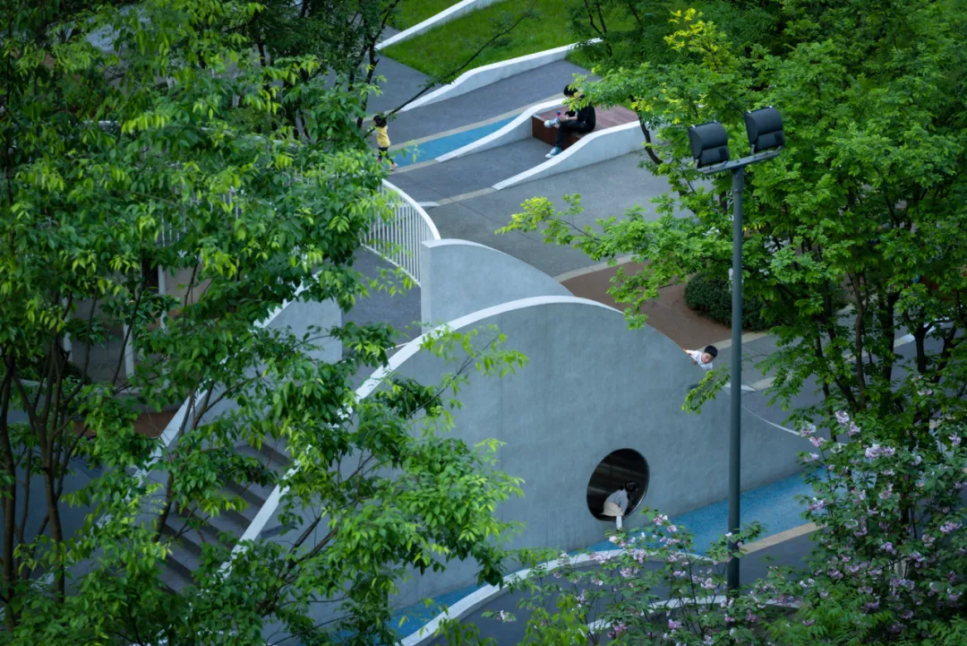 山丘迷宫是重庆绿城蘭园大区内的一个活动空间,是一个高强度复合性人群使用的区域。其形是对山水、假山的抽象,希望是横看成岭侧成峰的大地艺术。