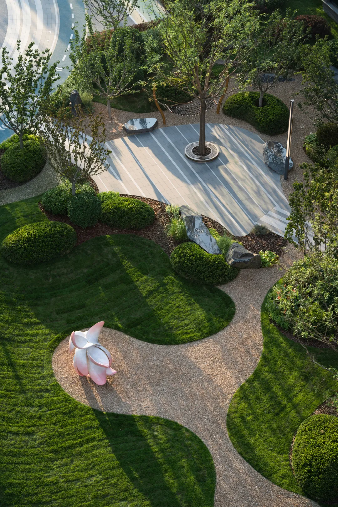 2、铺装与植物的互动设计:铺装以曲线勾勒 “水流” 形态,与球面灌木的 “岛屿” 形成呼应,营造出 “水绕岛、岛生绿” 的动态场景。