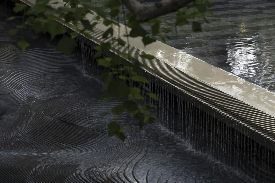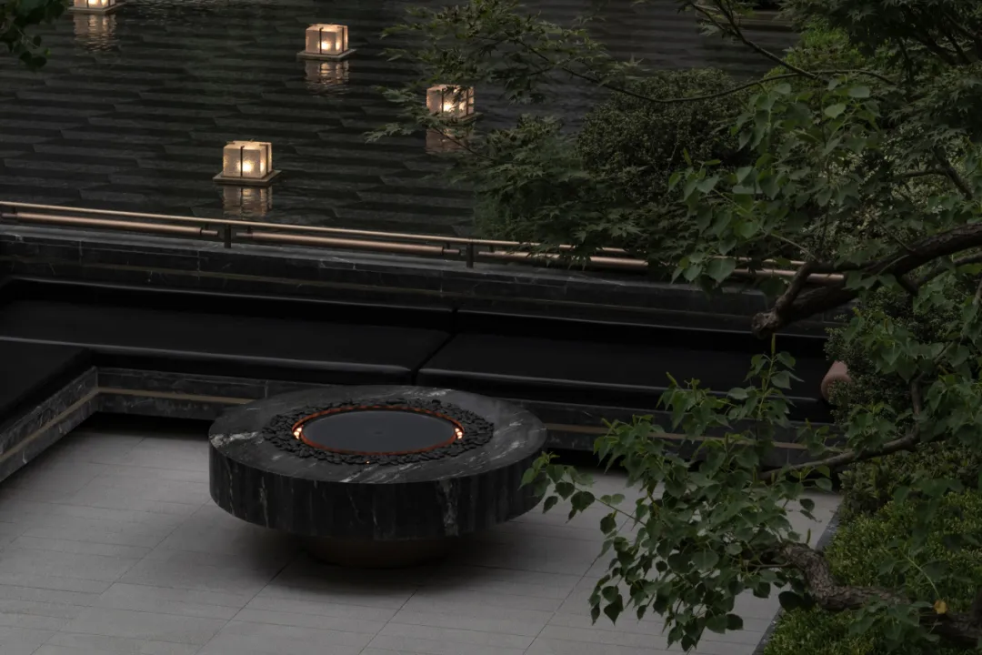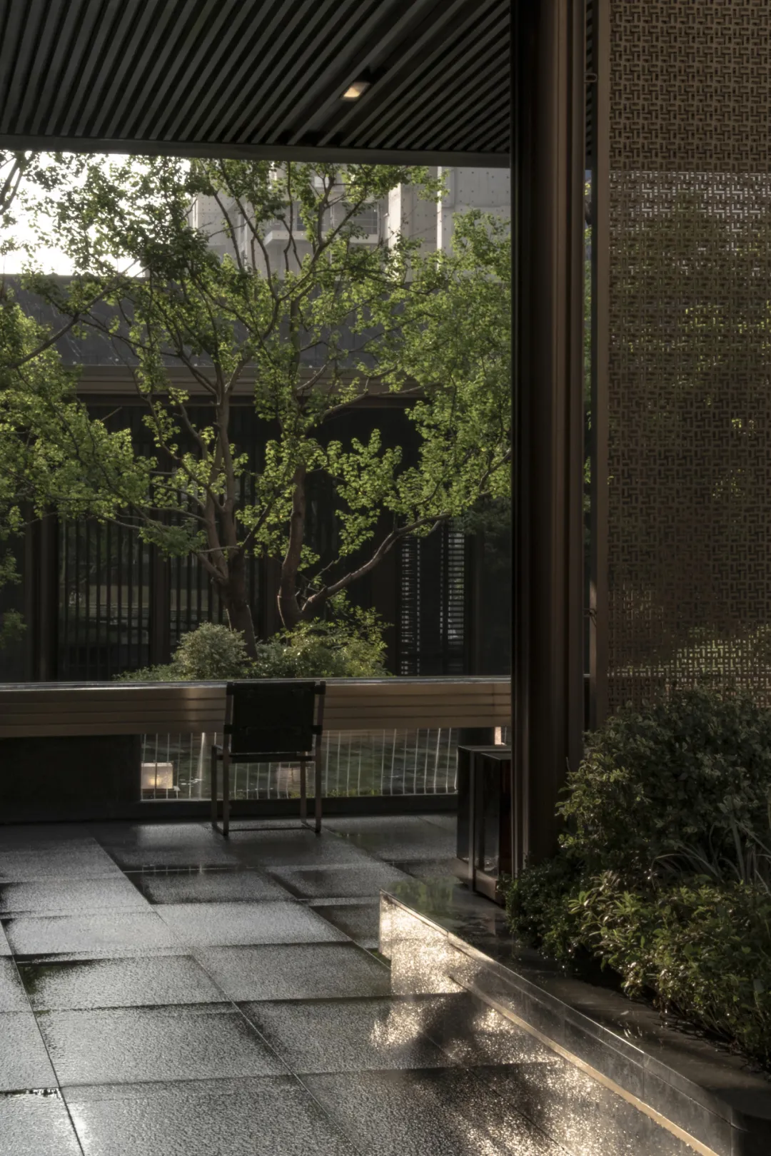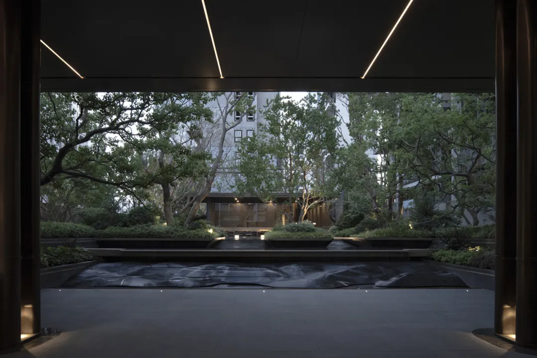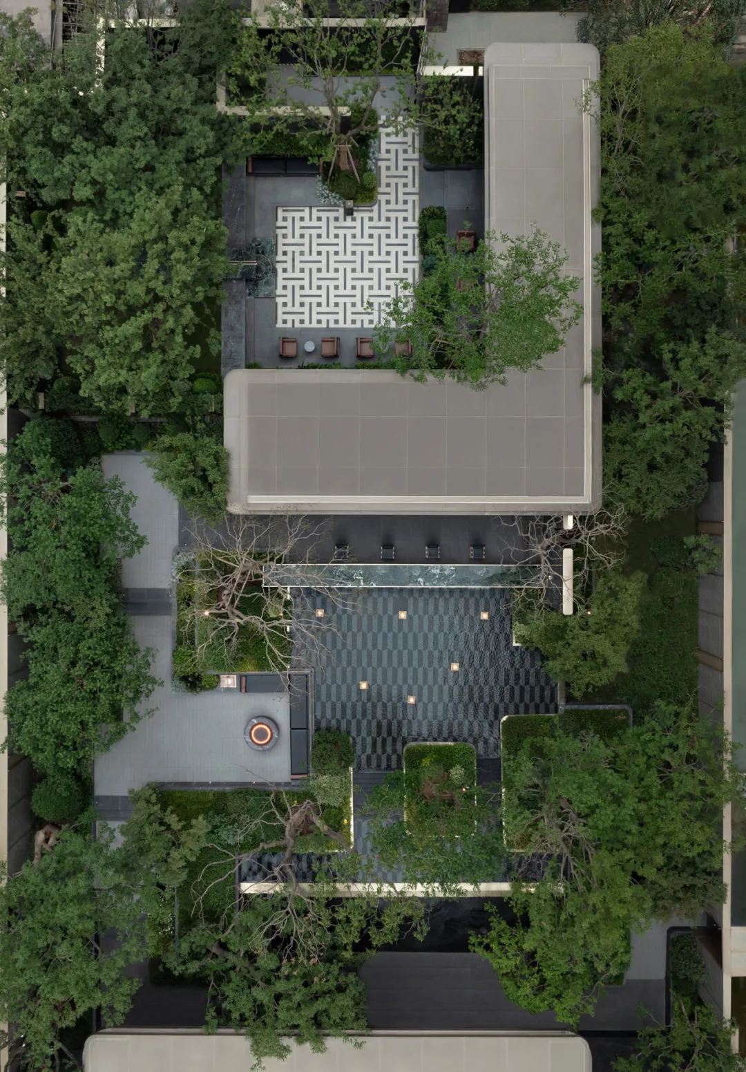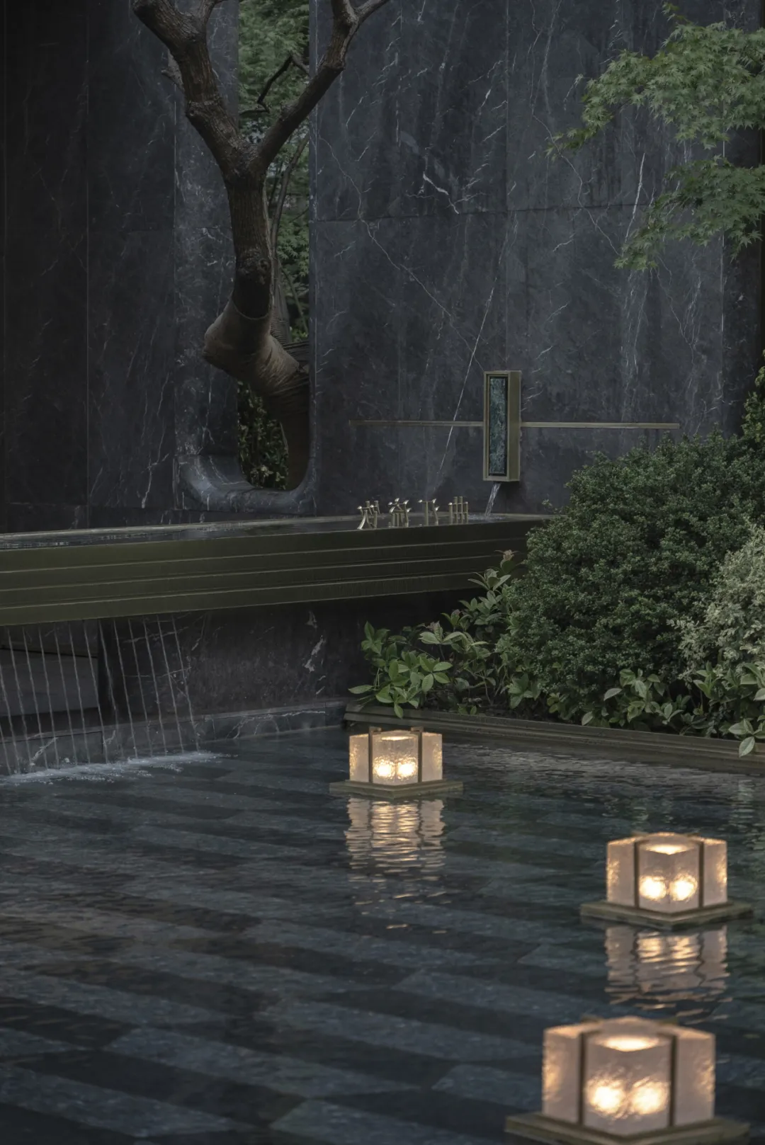 步入院内,褶皱山地模拟起伏的等高线,象征着西安的秦岭山脉。似山涧中的清泉潺潺而出,淌过用普拉达绿奢石镌刻的流水吧台,汇入一汪碧池,在乌桕林荫下仿佛走入了中国山水画里的场景。